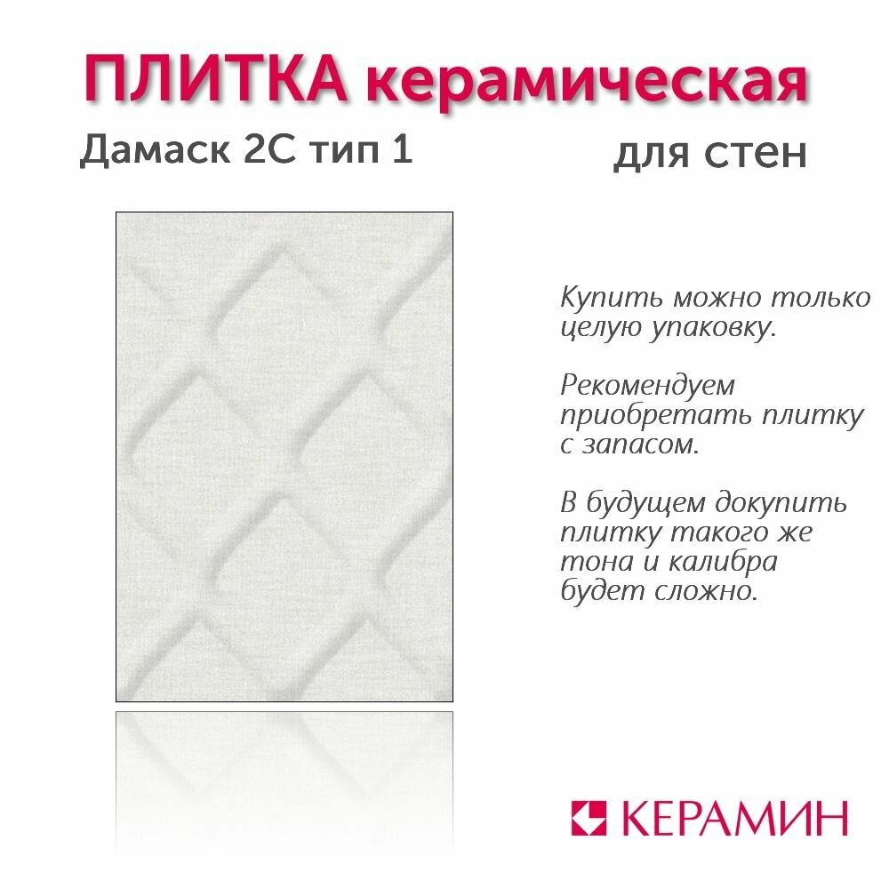 Ниже Вы можете прочитать отзывы на Плитка керамическая Дамаск 2С тип 1 40х27.5 см 1.65 м. кв., ознакомится с подробными характеристиками, посмотреть интересные обзоры и фотографии на Плитка керамическая Дамаск 2С тип 1 40х27.5 см 1.65 м. кв..