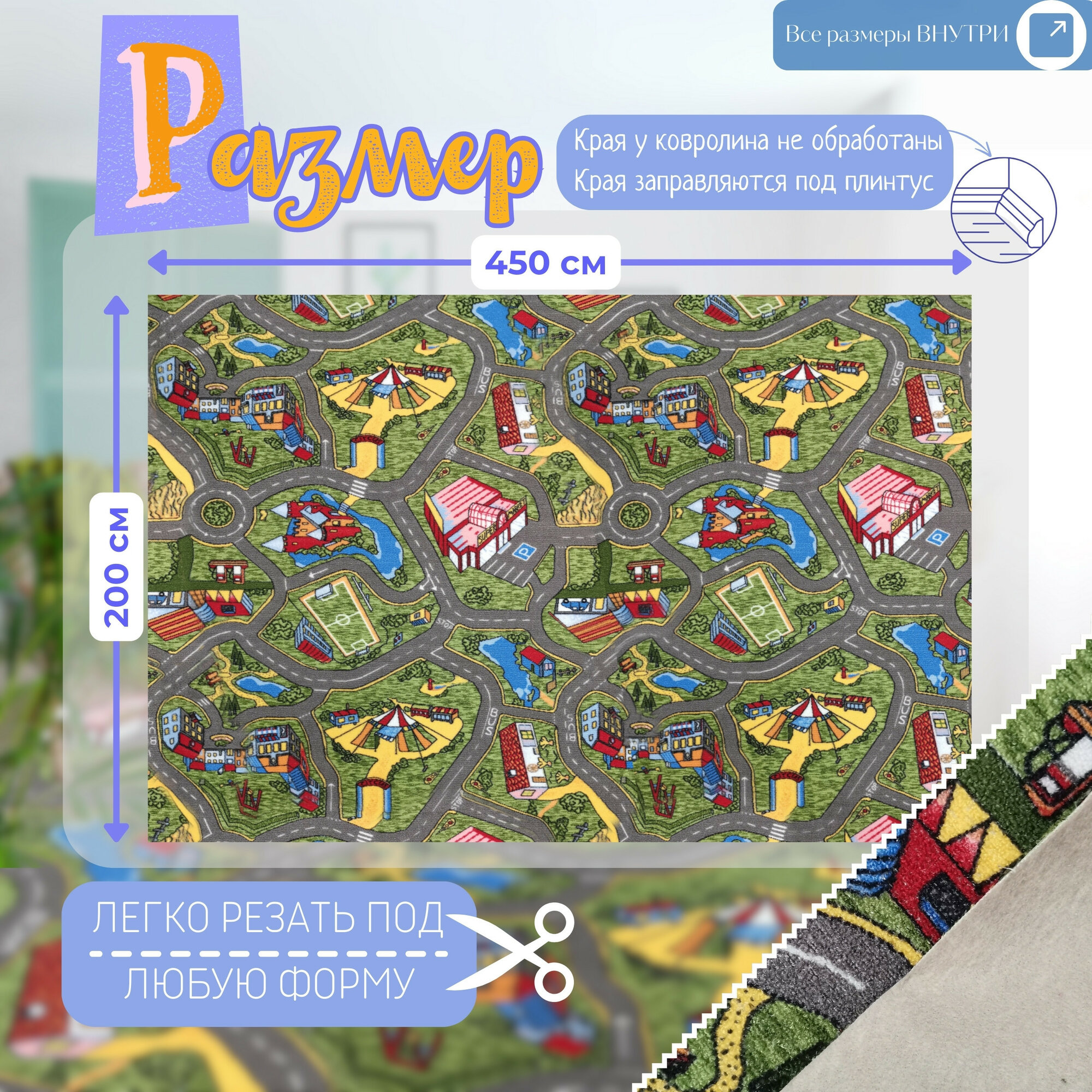 Детский ковролин 4х3 м, "С дорогами", серо-зеленый без оверлока