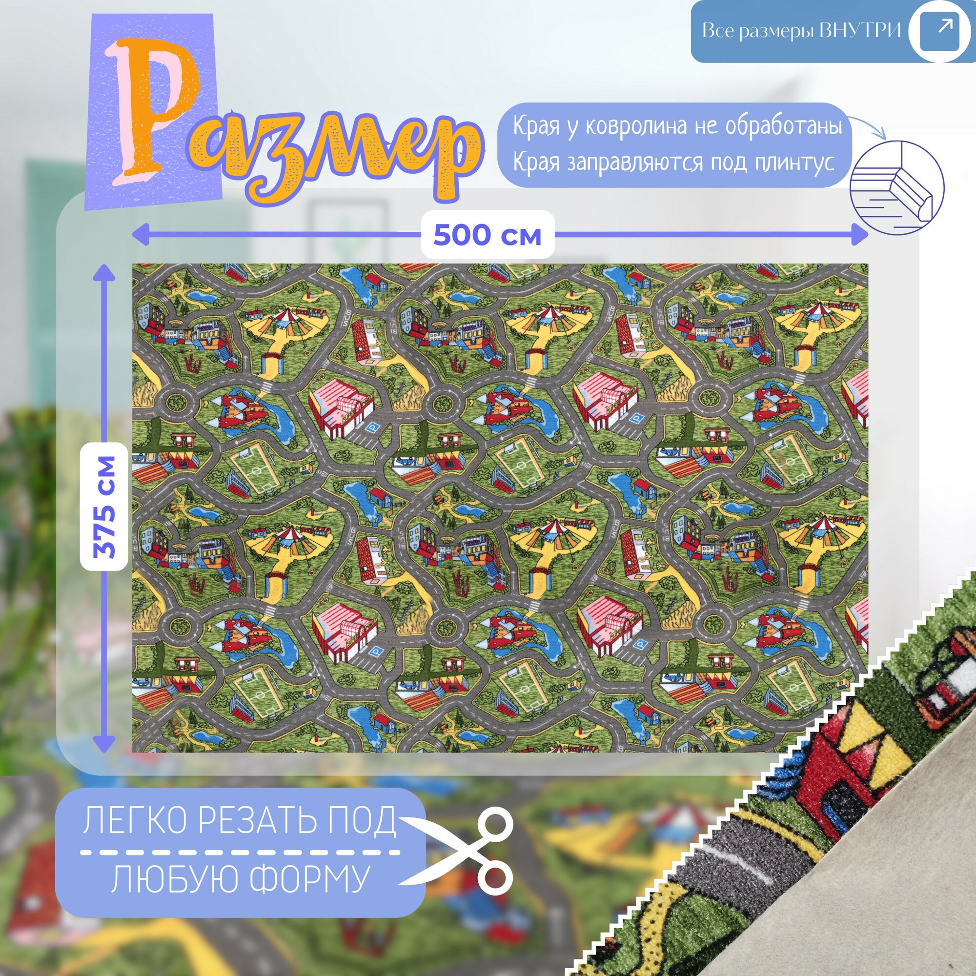 Детский ковролин 3,5х5 м, "С дорогами", серо-зеленый без оверлока