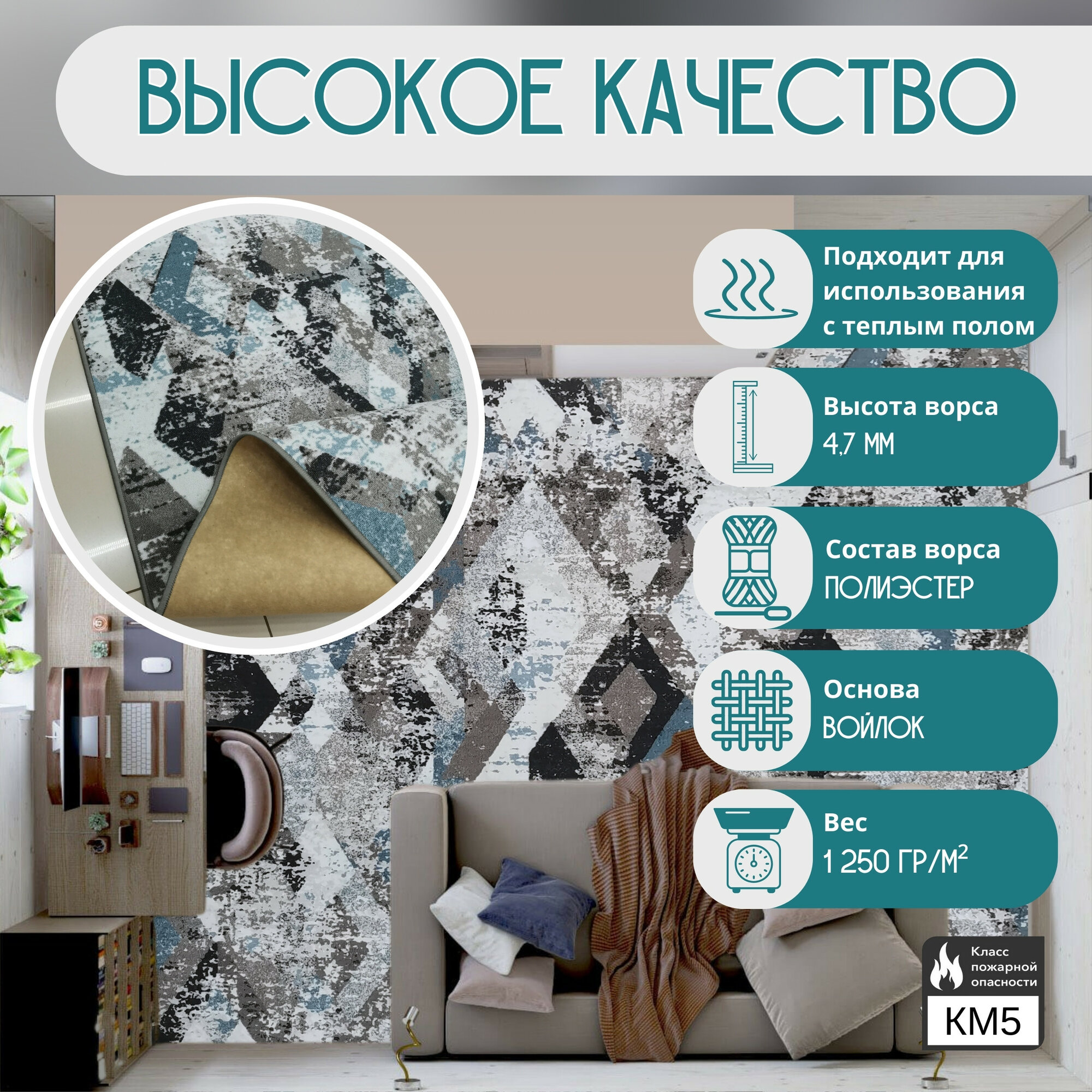 Ковролин метражом 2,5х4,5 м, гладкий "Ромб", серо-синий с оверлоком