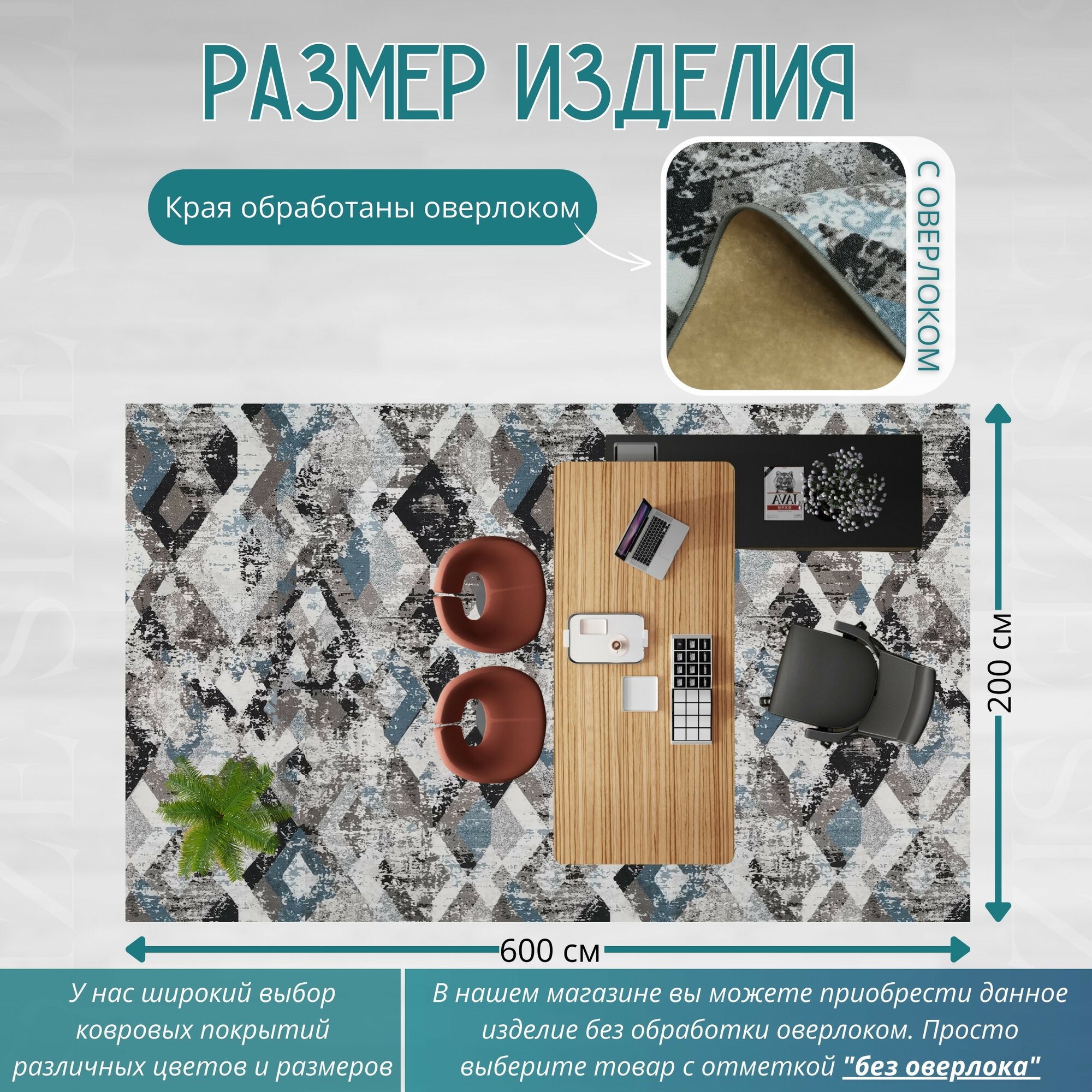 Ковролин метражом 2х3 м, гладкий "Ромб", серо-синий с оверлоком
