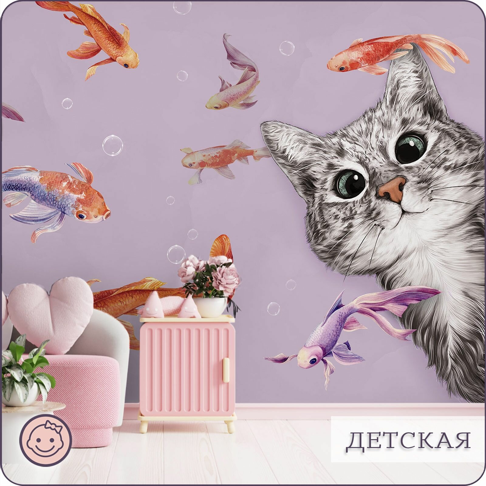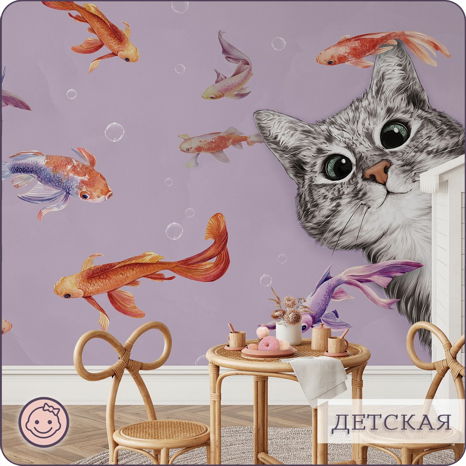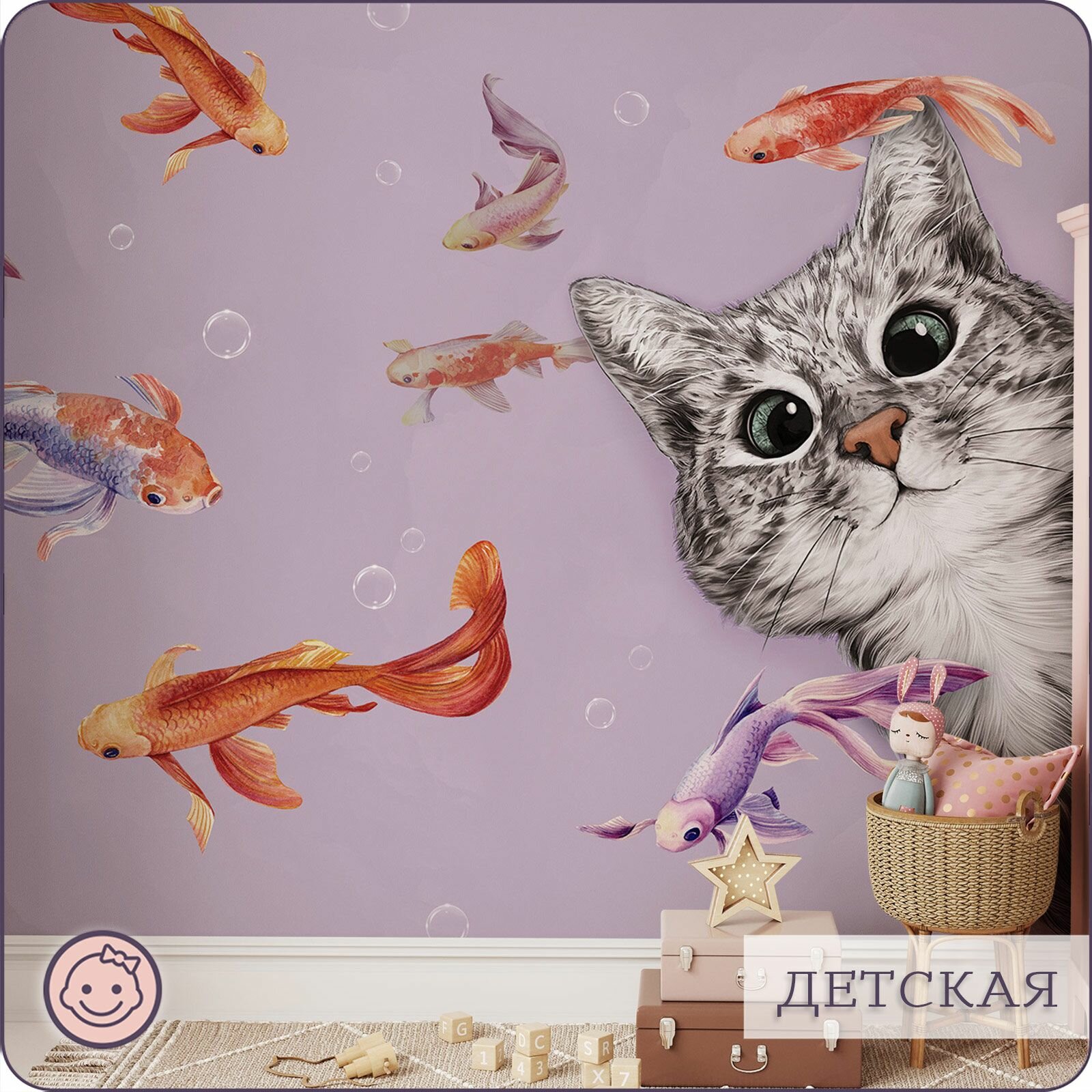 Купить Фотообои на стену флизелиновые 3d Детские Котенок Рыбки 500х270 см Bartonwall K299