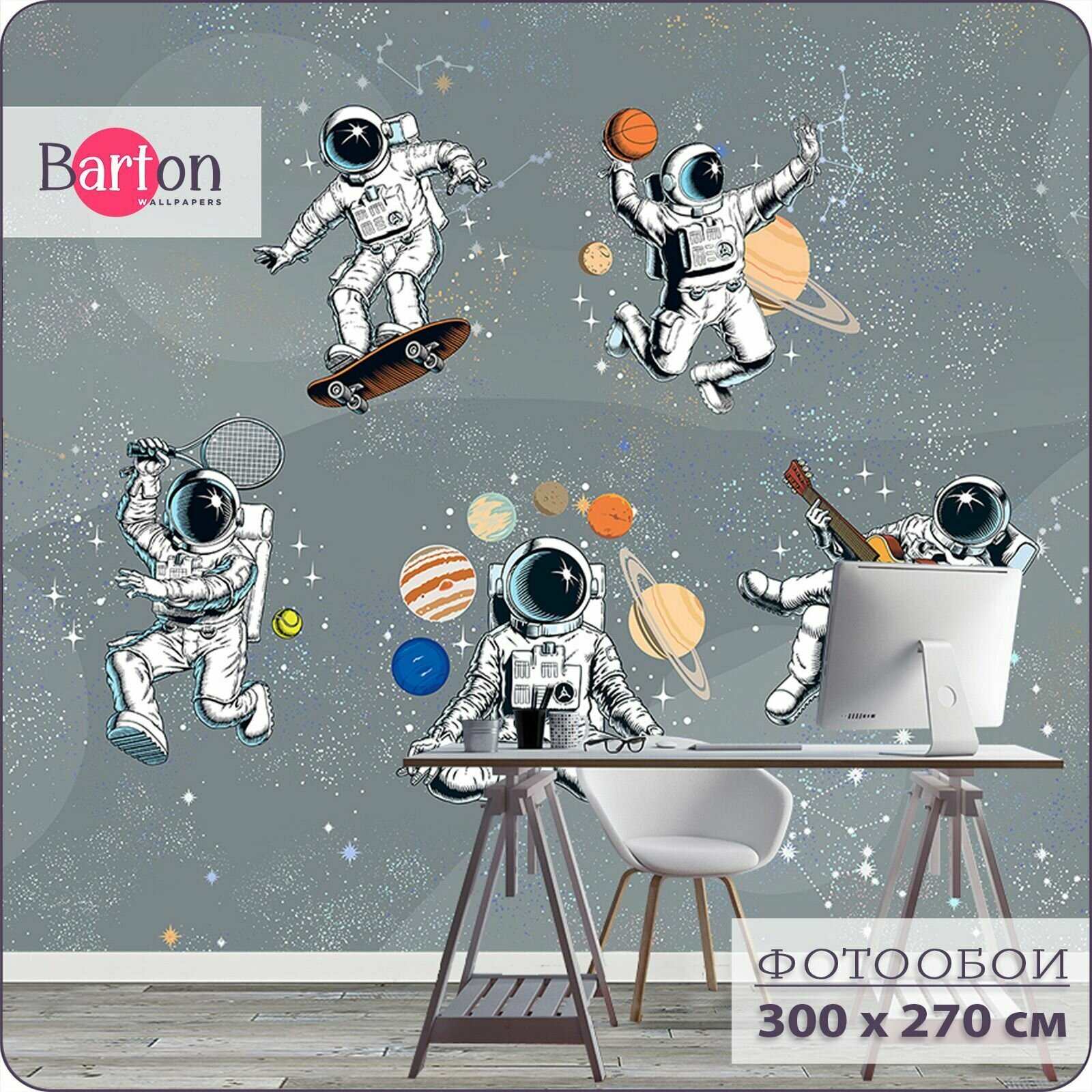 Фотообои на стену флизелиновые 3d Для подростка Лофт Космонавт на скейте 300х270 см Bartonwall M081