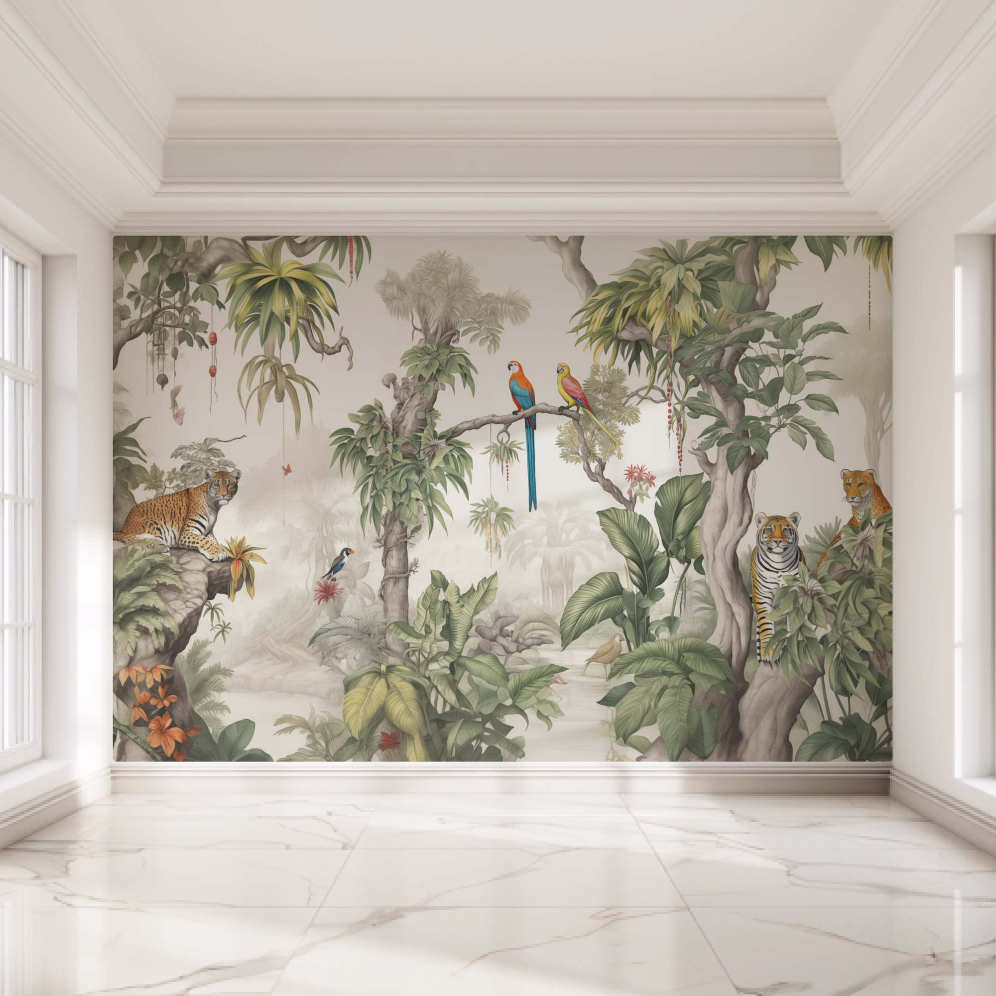 Купить Фотообои на стену 400х280 Тропический лес с листьями и животными.