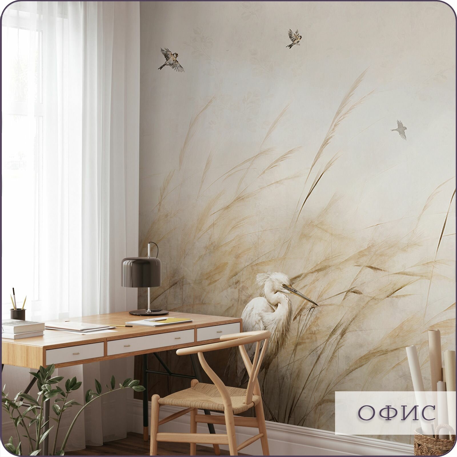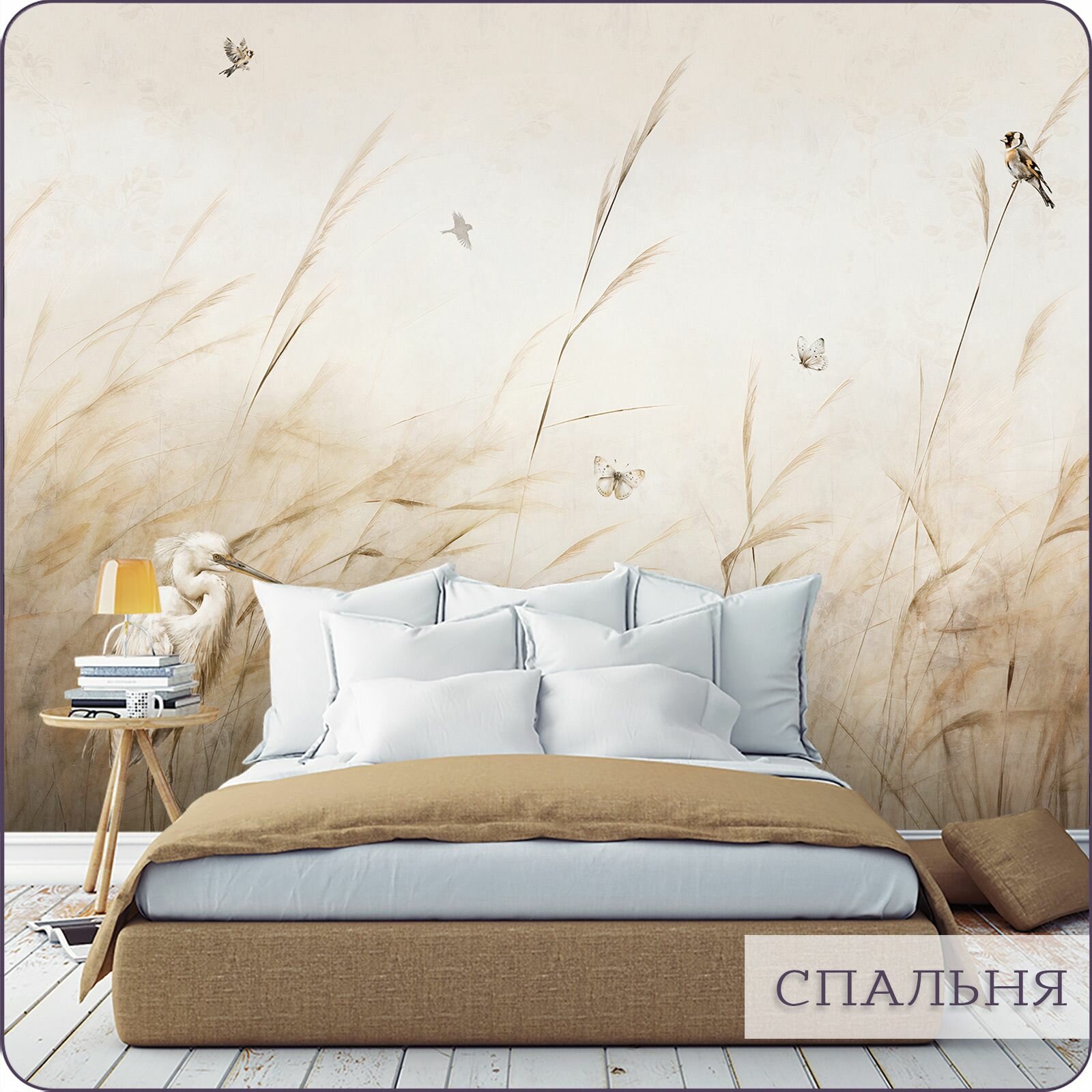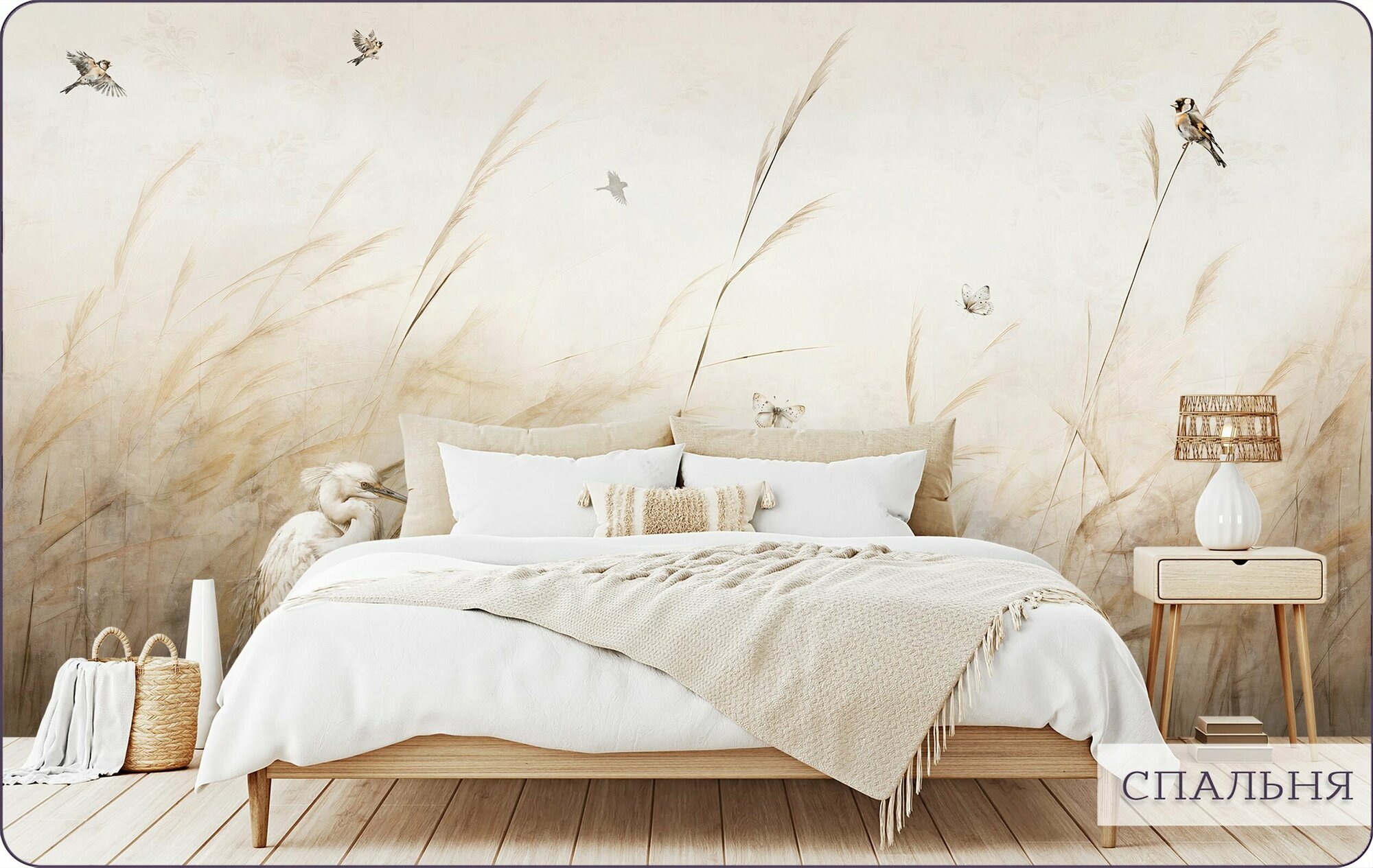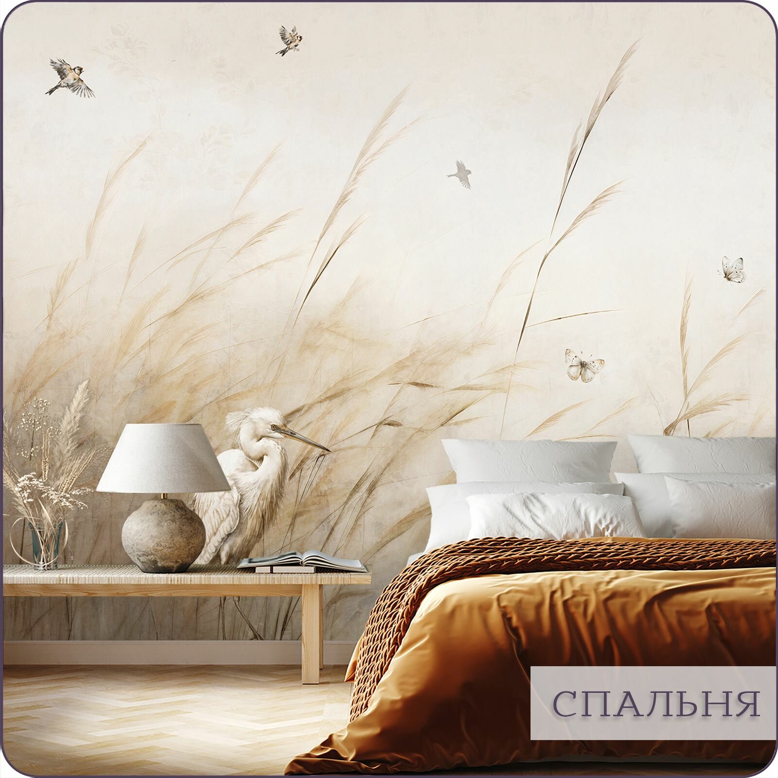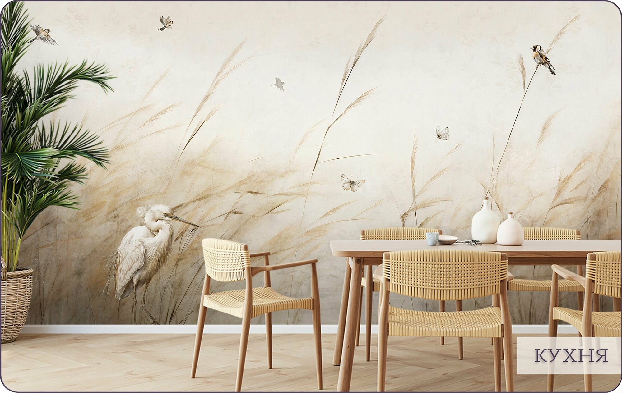 Фотообои на стену флизелиновые 3d Для кухни Цапля Камыши 200х270 см Bartonwall N144