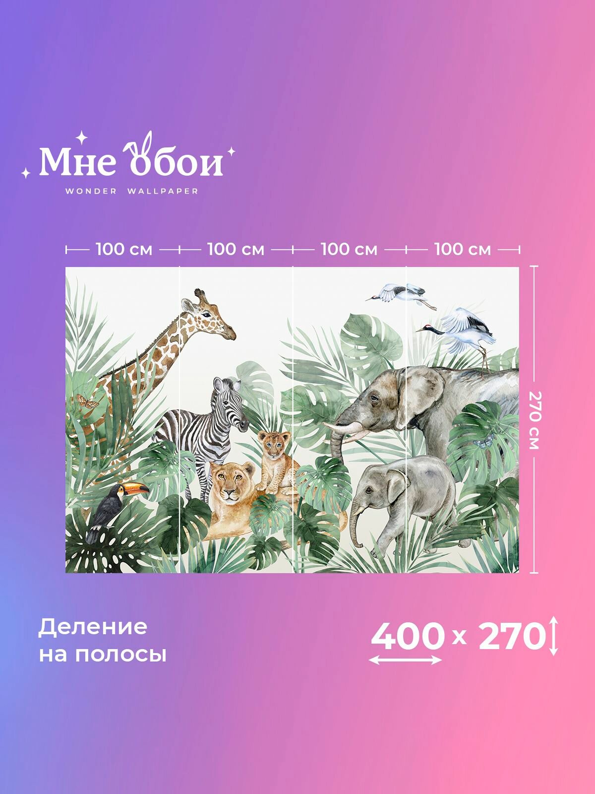 Фреска флизелиновая - детские 3D фотообои на стену "Джунгли" 270х270 (ШхВ), Животные, 3д обои в детскую