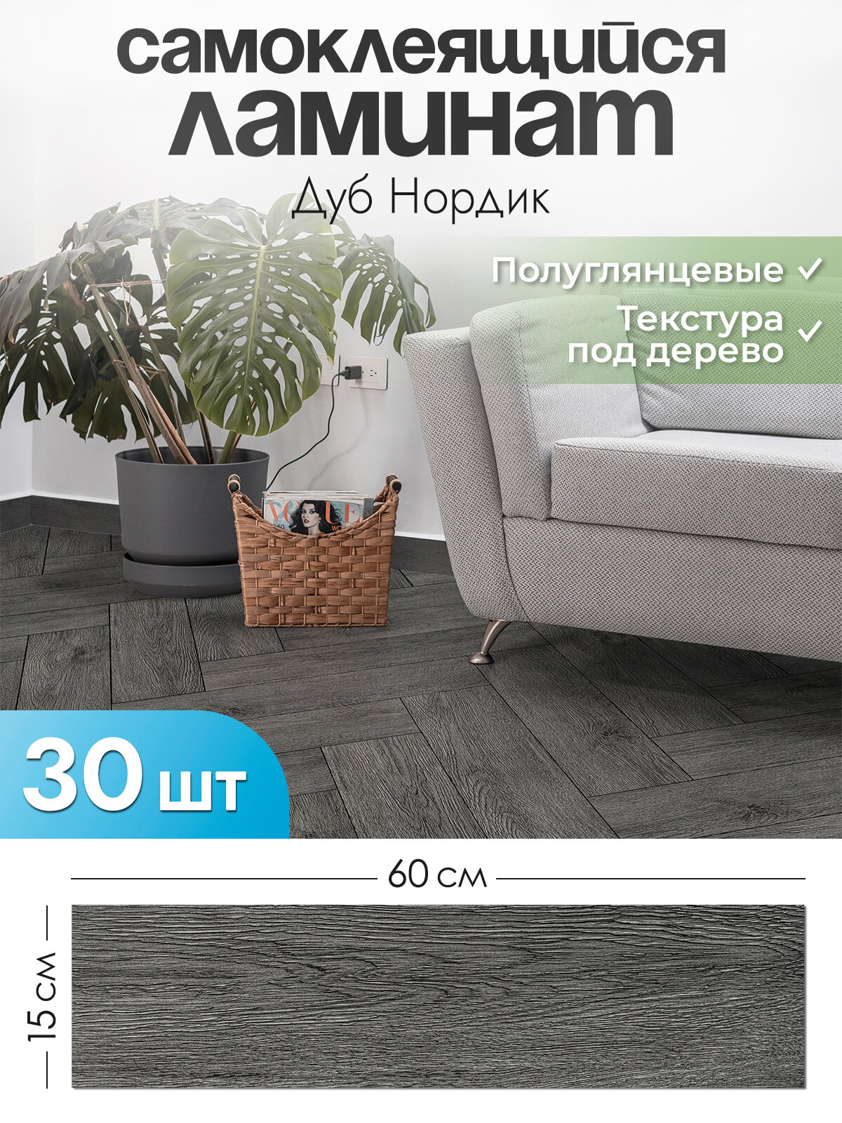 Купить "Дуб Нордик" Ламинат для пола самоклеящийся 60х15 см. Виниловый пол на кухню. Плитка для ванной и в коридор, 30 шт.