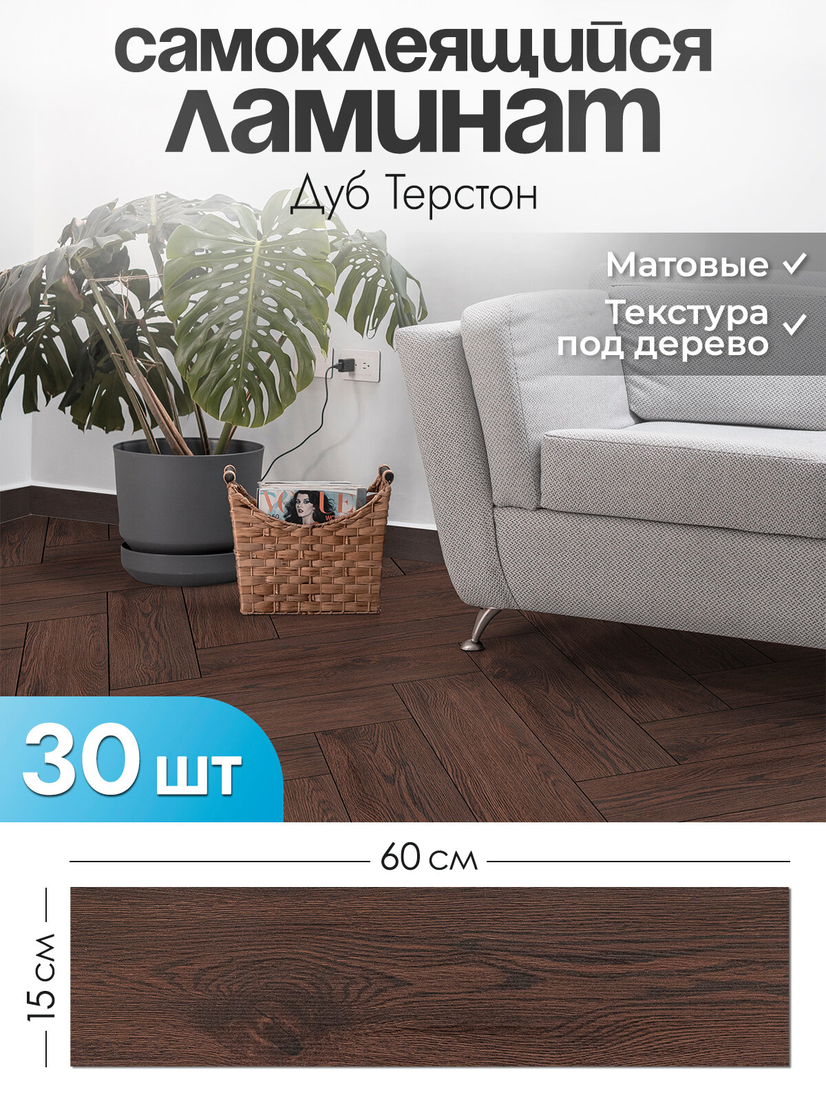 "Дуб Терстон" Ламинат для пола самоклеящийся 60х15 см. Виниловый пол на кухню. Плитка для ванной и в коридор, 30 шт. интересное: