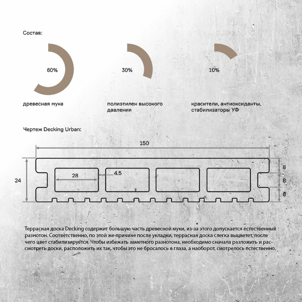 СохранитьТеррасная доска из ДПК Docke, Decking Urban PREMIUM, 150х24х1000 0,15м2 графит (Жженый Кедр), 4 шт интересное: