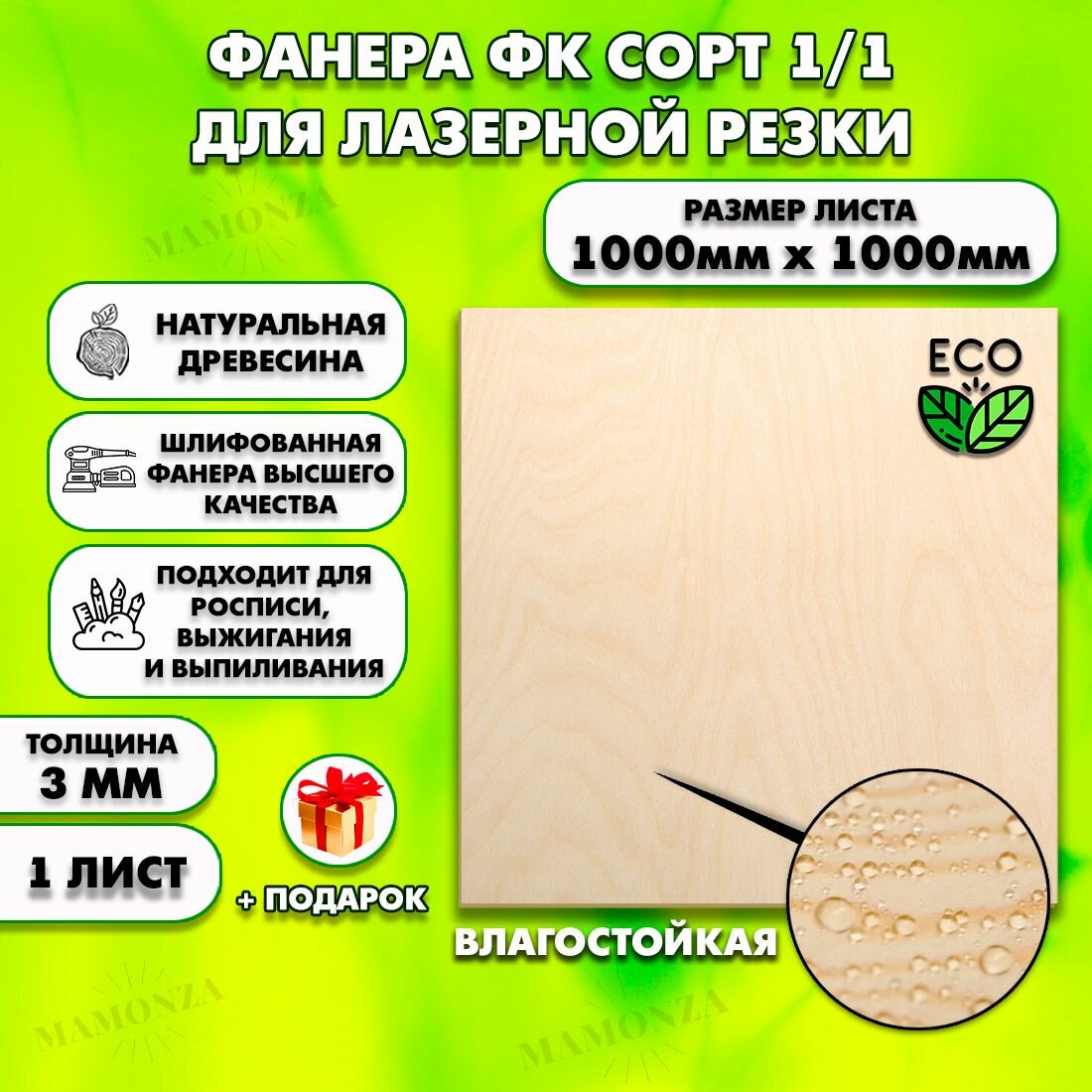 Купить Фанера для лазерной резки и гравировки, Строительная, Мебельная, Размер 1000х1000, 1 лист, Толщина 3мм, сорт 1/1