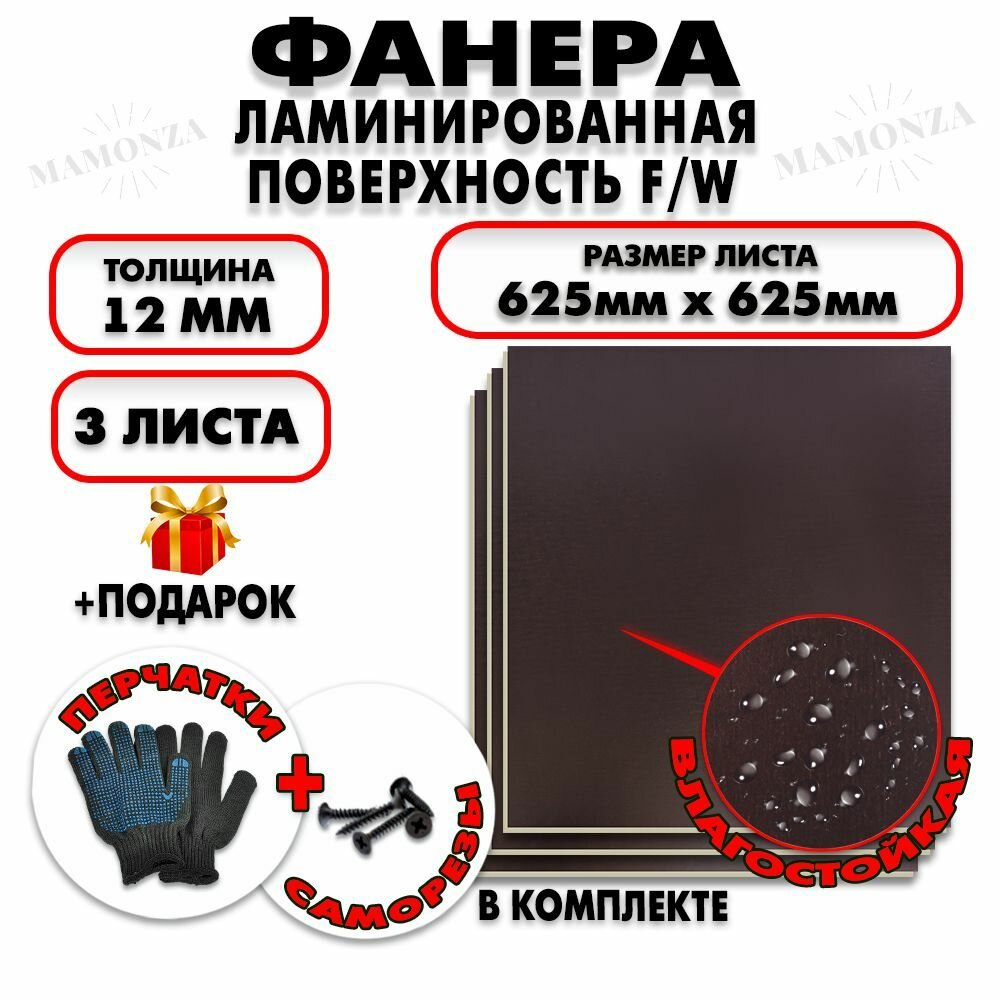 Фанера ФСФ ламинированная/сетчатая F/W толщина 12мм 625х500мм 3 листа