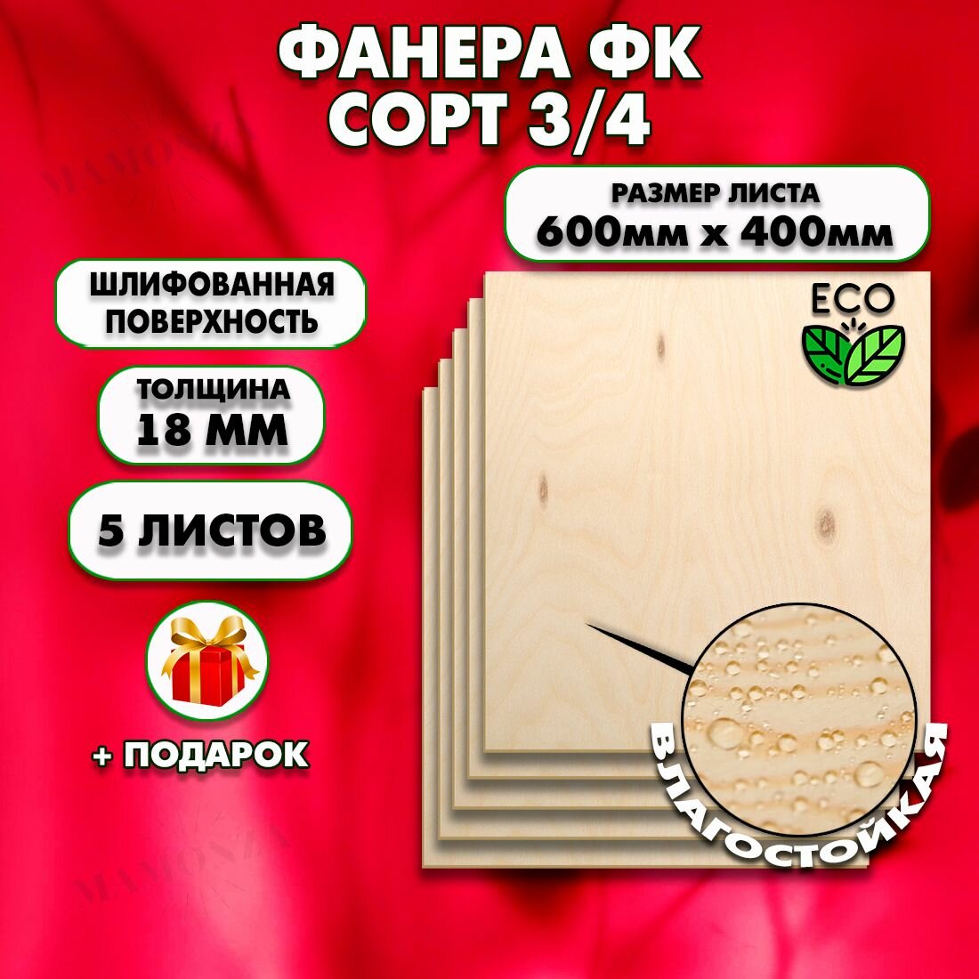 Купить Строительная, Мебельная Фанера, Размер 600х400, 5 листов, Толщина 18мм, сорт 3/4
