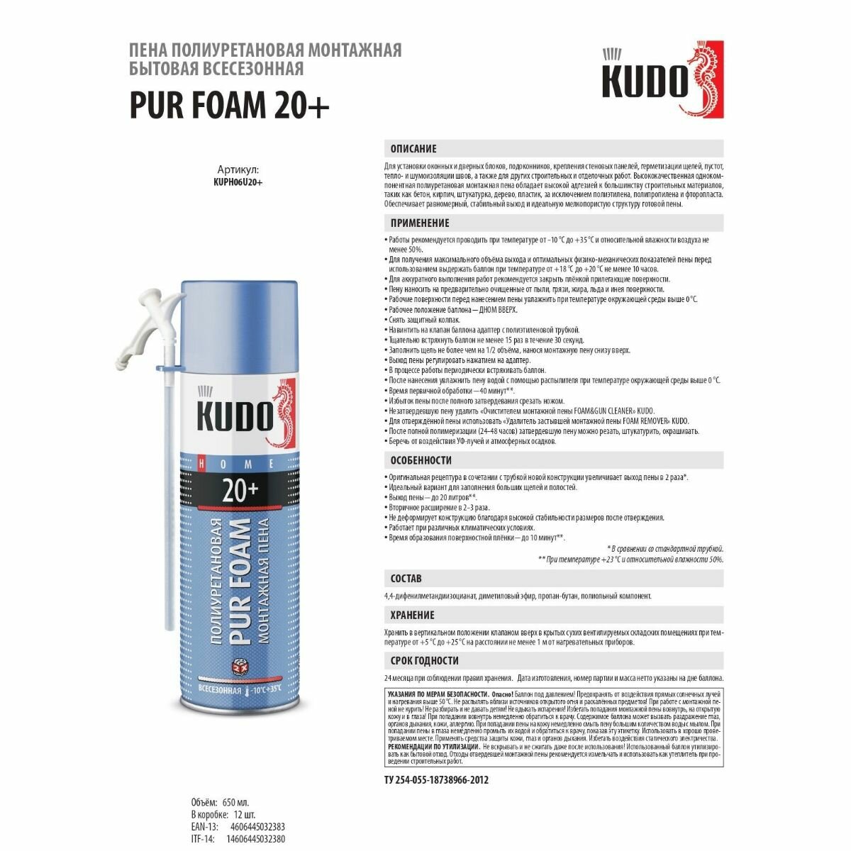 Пена монтажная KUDO HOME 20+ бытовая всесезонная 650мл / KUPH06U20+