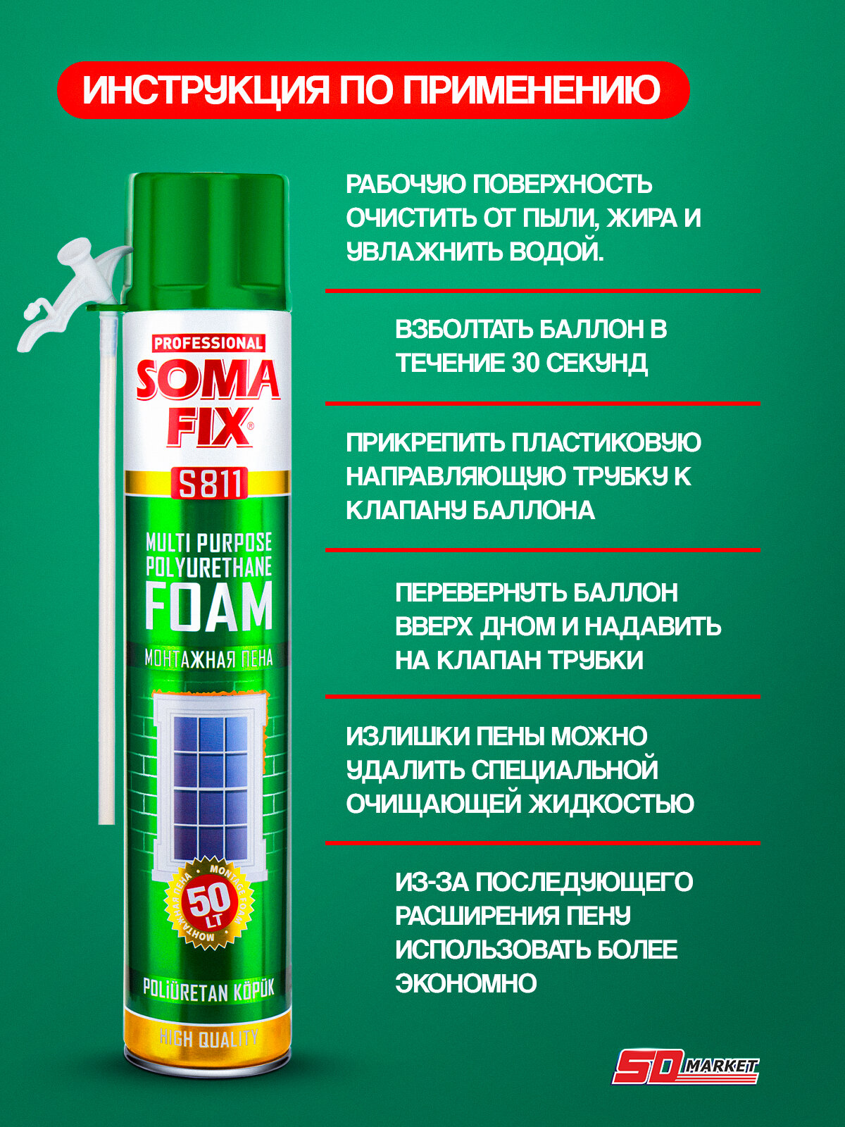 Пена монтажная с трубкой 500мл, пена монтажная бытовая Somafix, выход до 30 литров