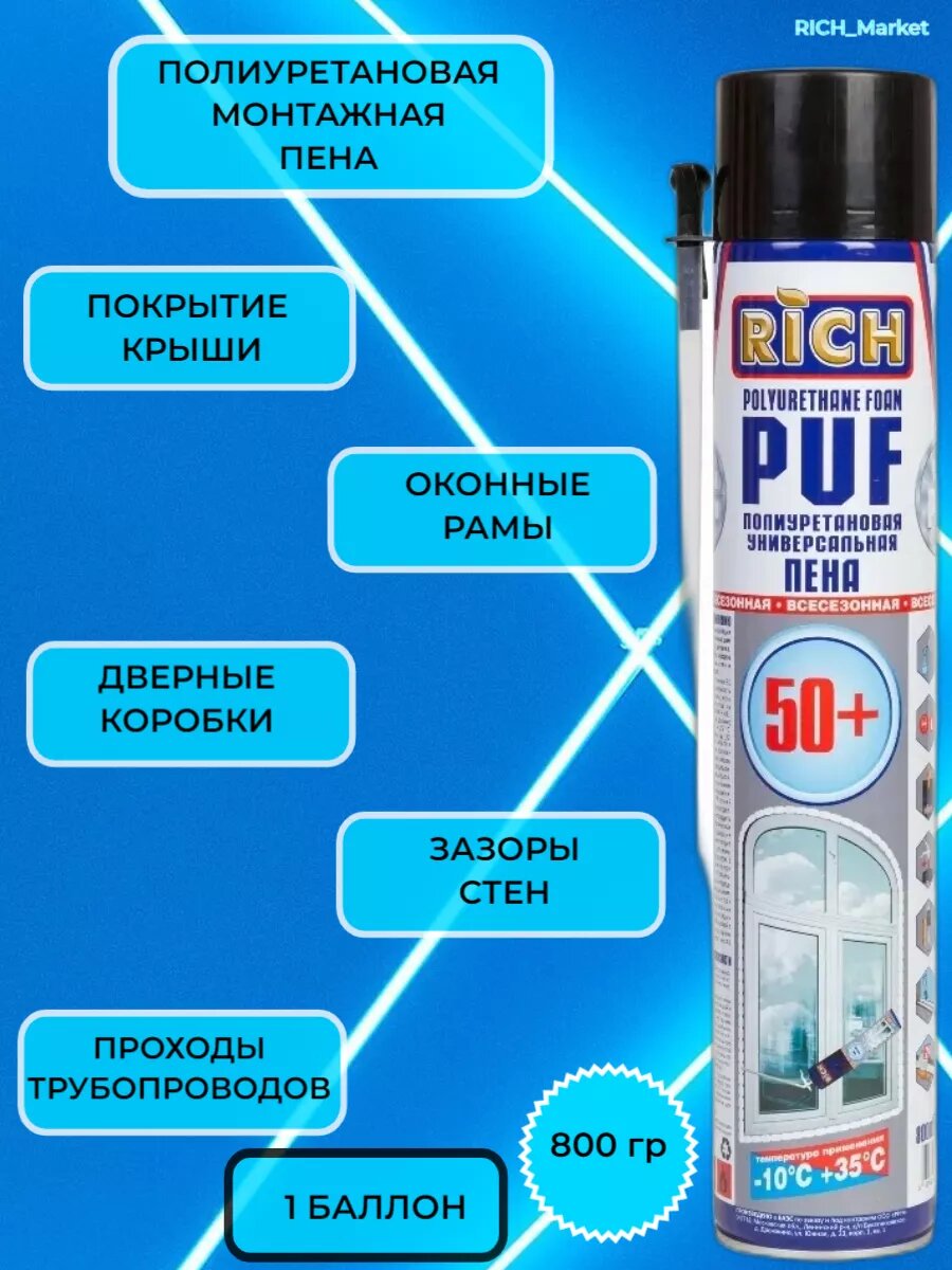 Монтажная пена RICH 50+, профессиональная, с трубкой-адаптером, всесезонная 1-баллон интересное: