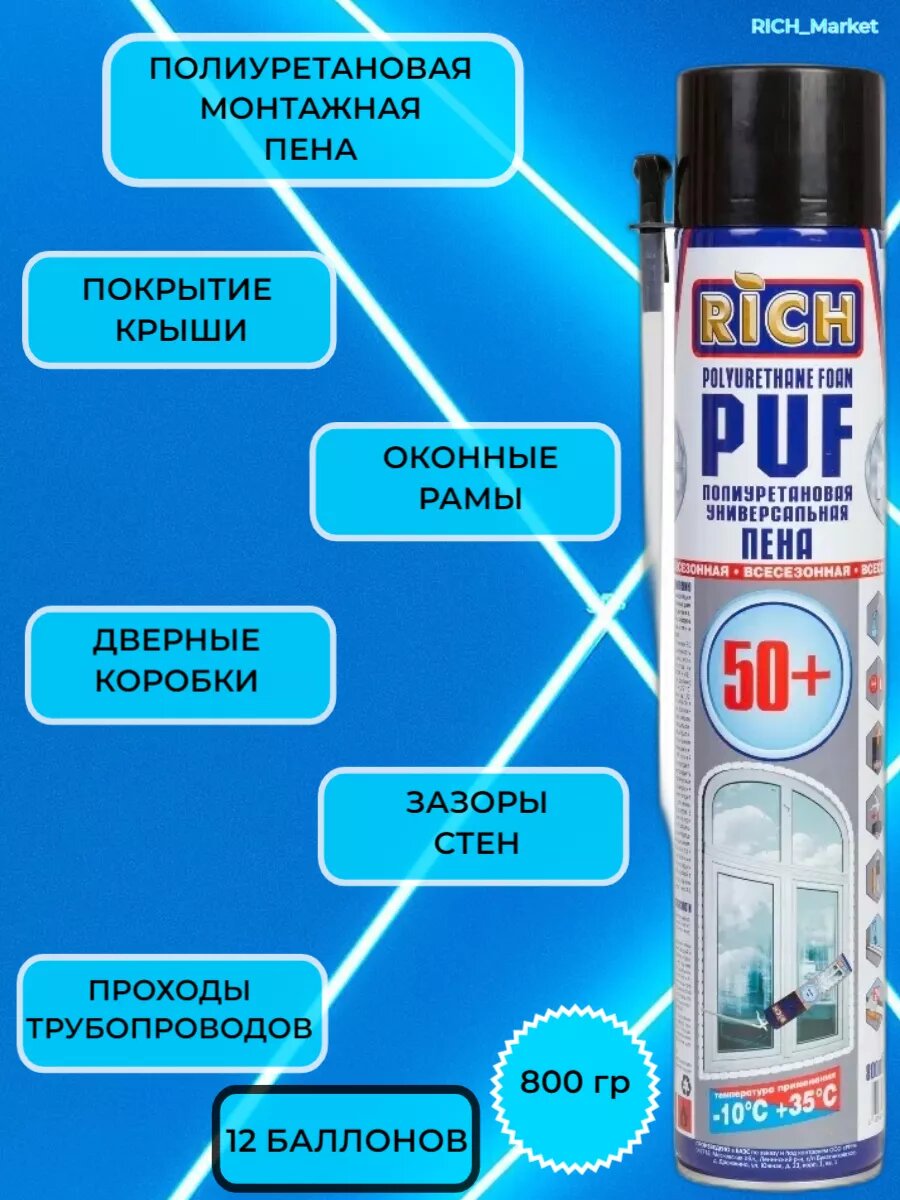 Монтажная пена RICH 50+, профессиональная, с трубкой-адаптером, всесезонная, 12 баллонов интересное: