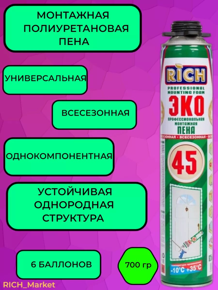 Монтажная пена RICH 45+ профессиональная, под пистолет, всесезонная, 6 баллонов интересное:
