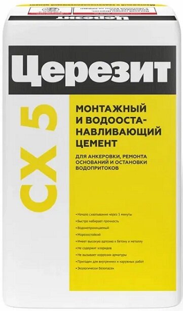 Ниже Вы можете прочитать отзывы на Цемент Водоостанавливающий 25кг Ceresit CX 5 Монтажный / Церезит СХ 5., ознакомится с подробными характеристиками, посмотреть интересные обзоры и фотографии на Цемент Водоостанавливающий 25кг Ceresit CX 5 Монтажный / Церезит СХ 5..