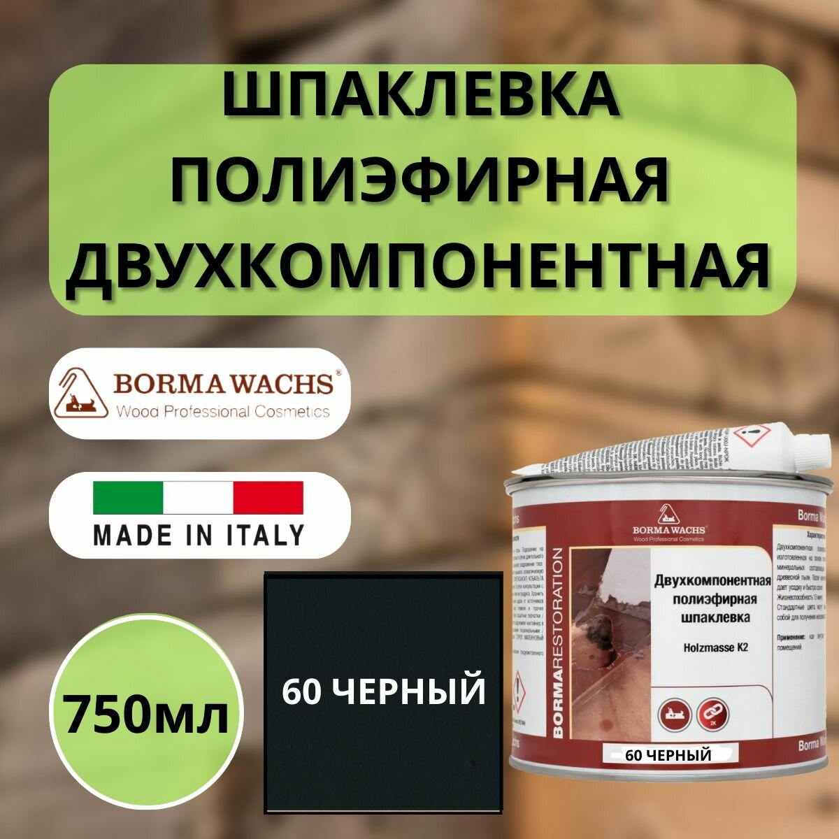 Двухкомпонентная полиэфирная шпаклевка Borma Holzmasse K2 750 мл 60 Чёрный 1960NE-6T интересное: