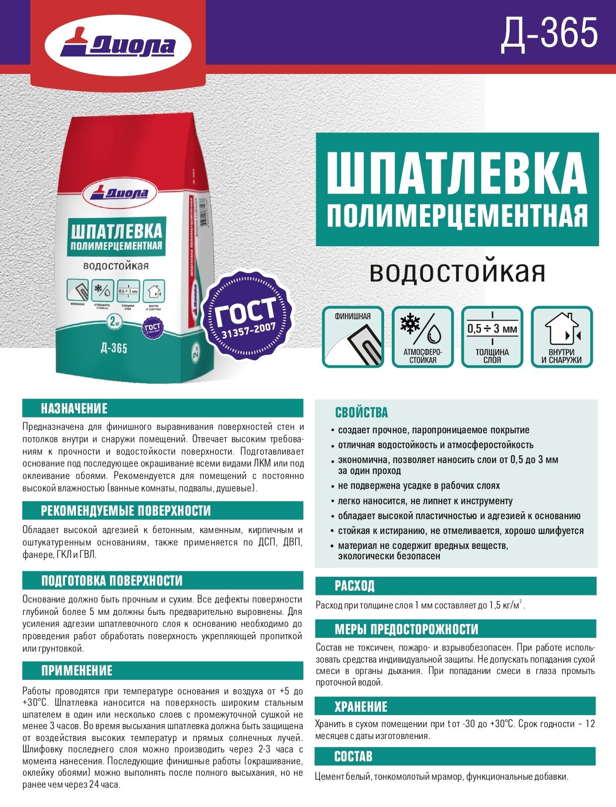 Шпатлевка финишная полимер-цементная водостойкая Д-365 Диола 10кг белый интересное: