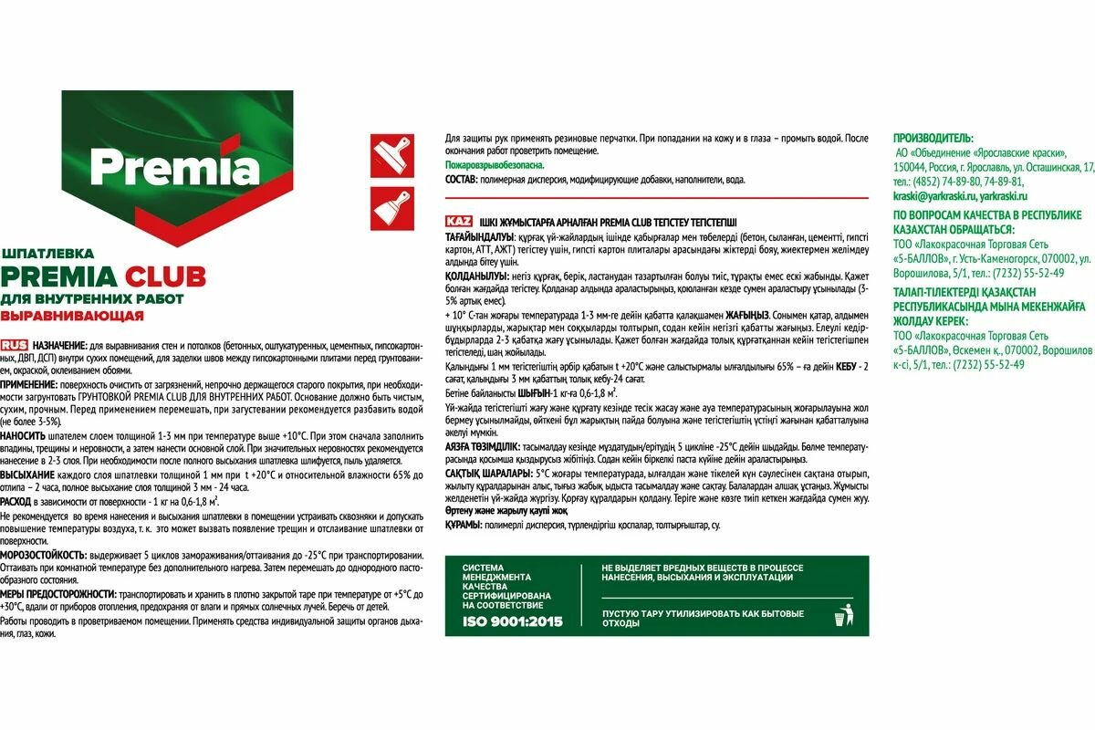 Шпаклевка выравнивающая для внутренних работ Premia Club ведро 8 кг О03932 интересное: