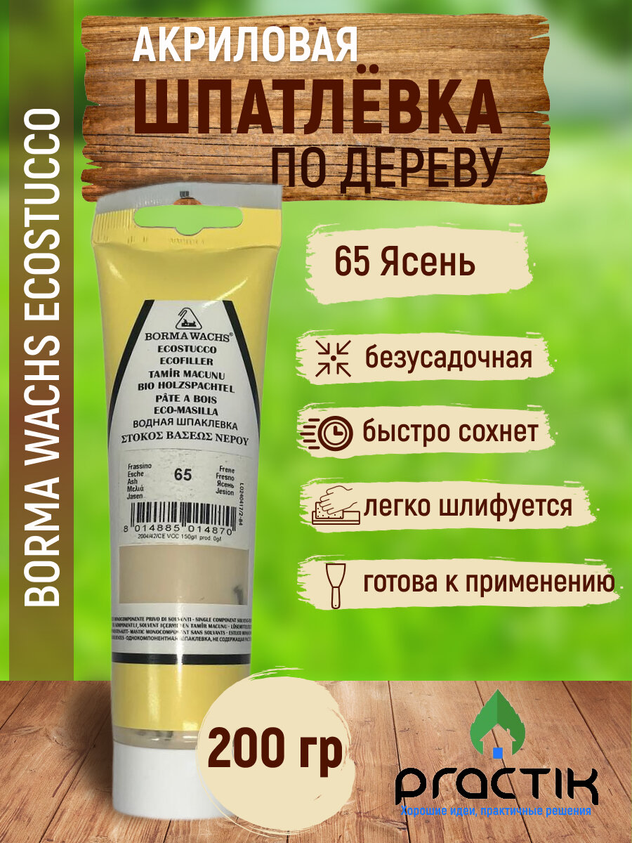 Шпаклёвка по дереву акриловая на водной основе безусадочная, в тубе, Borma Wachs Ecostucco 200гр, Ясень 65 , Быстро сохнет, легко шлифуется. интересное: