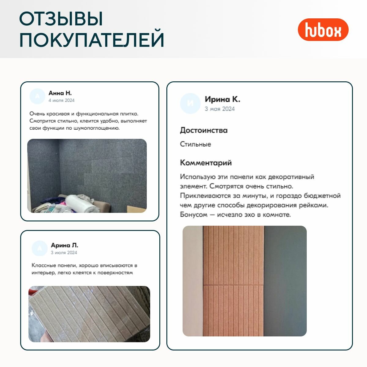 Ниже Вы можете прочитать отзывы на Акустические панели звукоизоляционные самоклеящиеся. Шумоизоляция для стен Hubox, 3 шт. рейки, графитовый, ознакомится с подробными характеристиками, посмотреть интересные обзоры и фотографии на Акустические панели звукоизоляционные самоклеящиеся. Шумоизоляция для стен Hubox, 3 шт. рейки, графитовый.