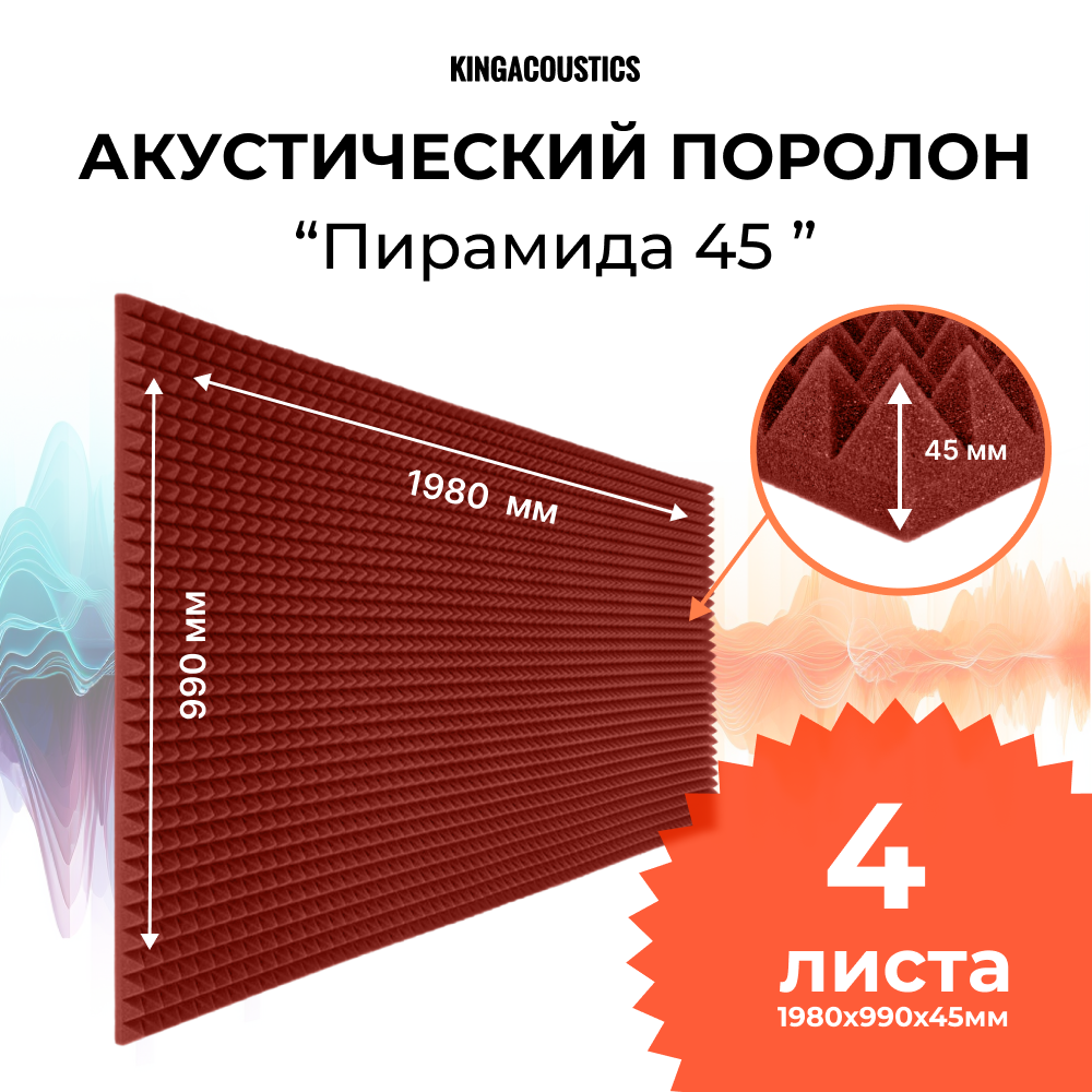 Купить Акустический поролон Пирамида 45мм 4 листа 1980х990х45мм красно-коричневого цвета