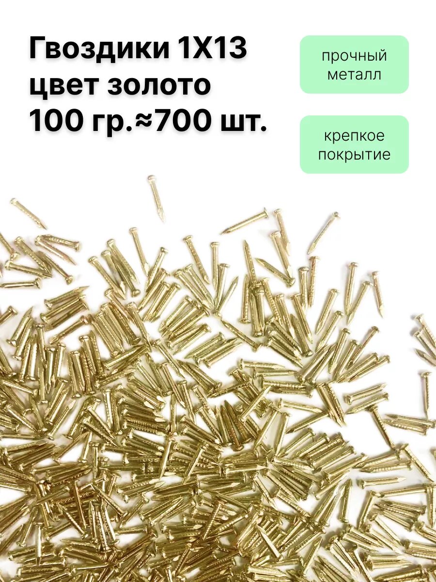 СохранитьГвозди декоративные Decupe с округлой шляпкой, размер 1х13 мм цвет золото, упаковка 100г (примерно 700шт) интересное: