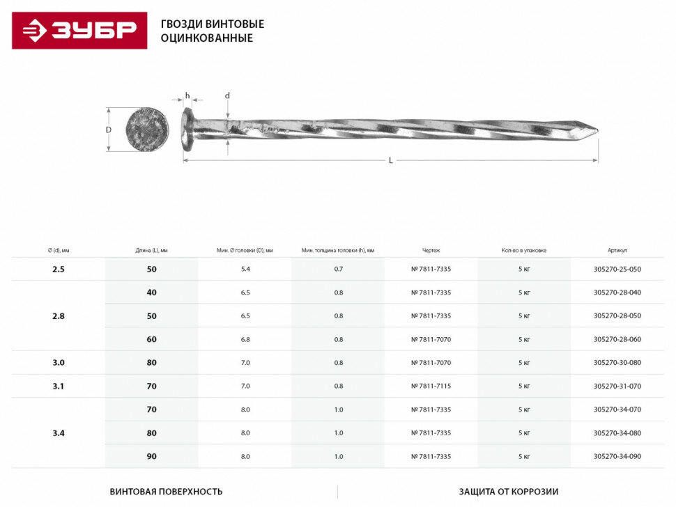 ЗУБР Гвозди винтовые оцинкованные, 90 х 3.4 мм, 5 кг, ЗУБР, ( 305270-34-090 ) интересное: