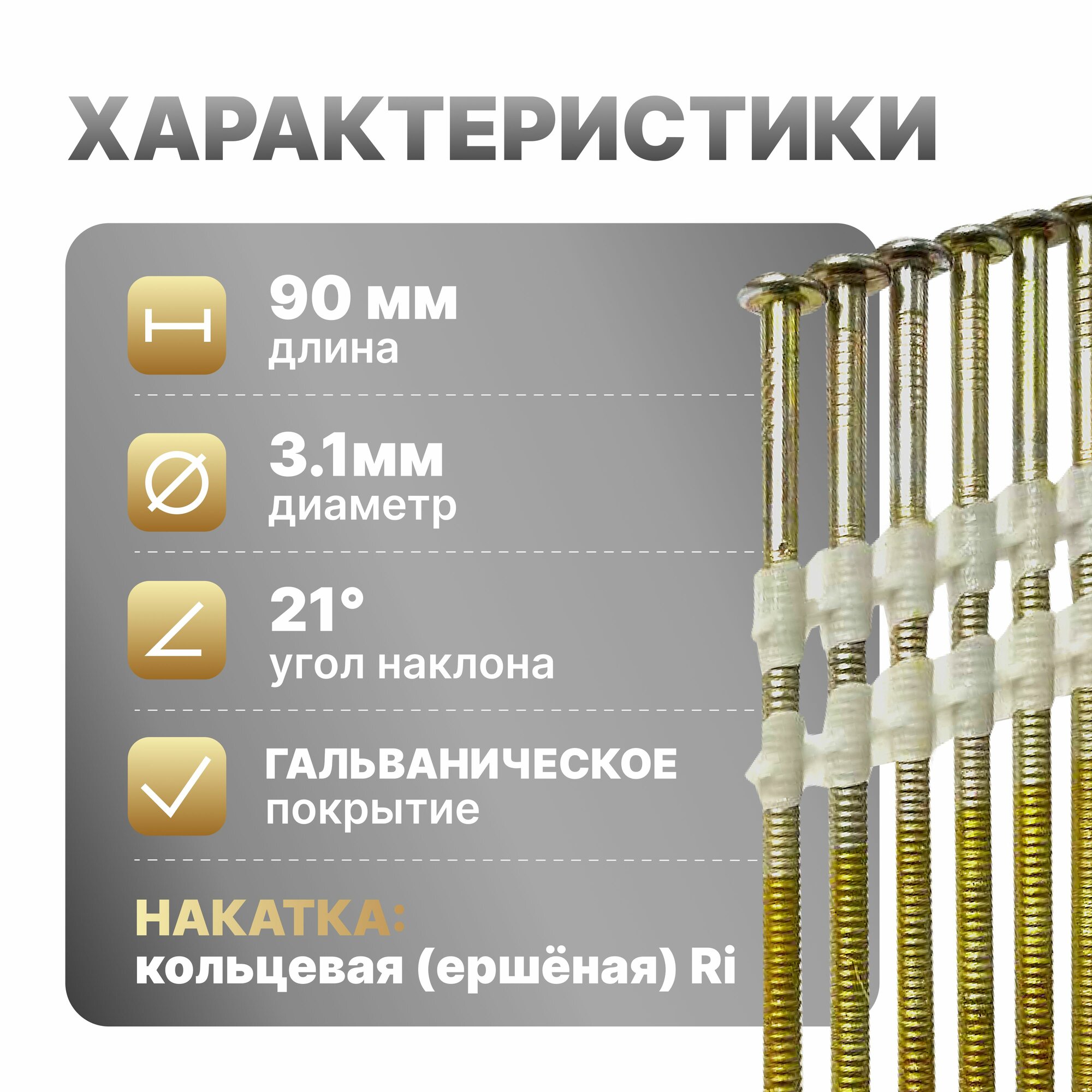 Гвозди реечные 21 градус 3.1/90 мм оцинкованные с кольцевой накаткой RiCnk, 1000 штук
