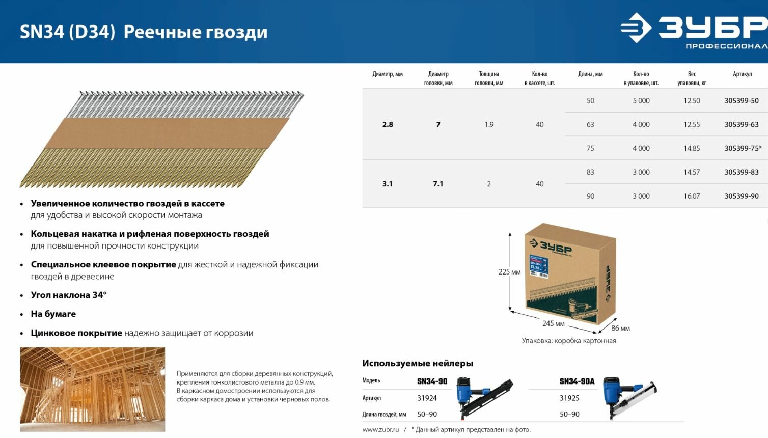 Реечные гвозди рифленые оцинкованные SN34(D34) 50х2.8 мм,5000 шт, ЗУБР 305399-50 интересное: