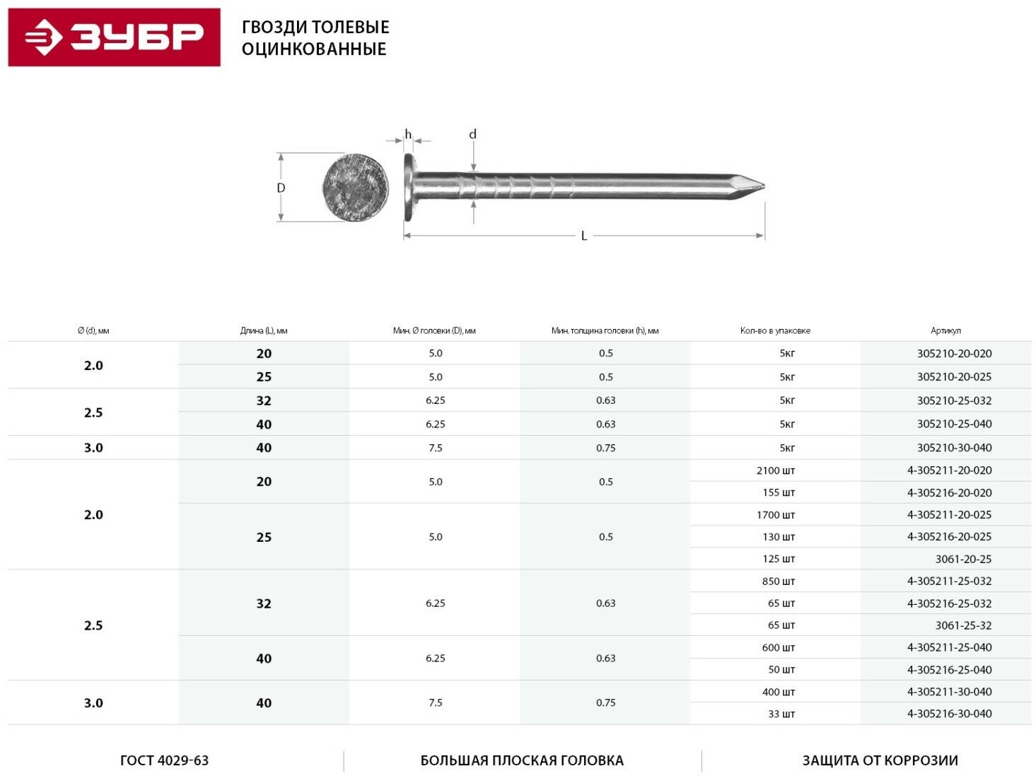ЗУБР ГОСТ 4029-63 20 х 2.0 мм, толевые гвозди оцинкованные, 5 кг (305210-20-020) интересное: