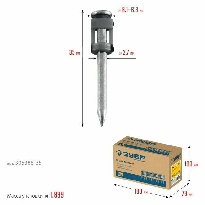 Купить Гвозди по бетону оцинкованные 1000 шт 35х2.7 мм ЗУБР 305388-35