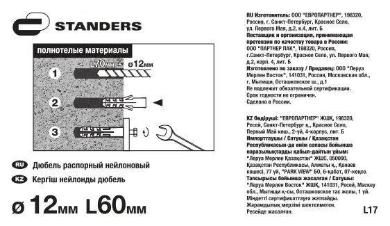 Дюбель шестигранный Standers PND 12x60 мм, нейлон, 4 шт. интересное: