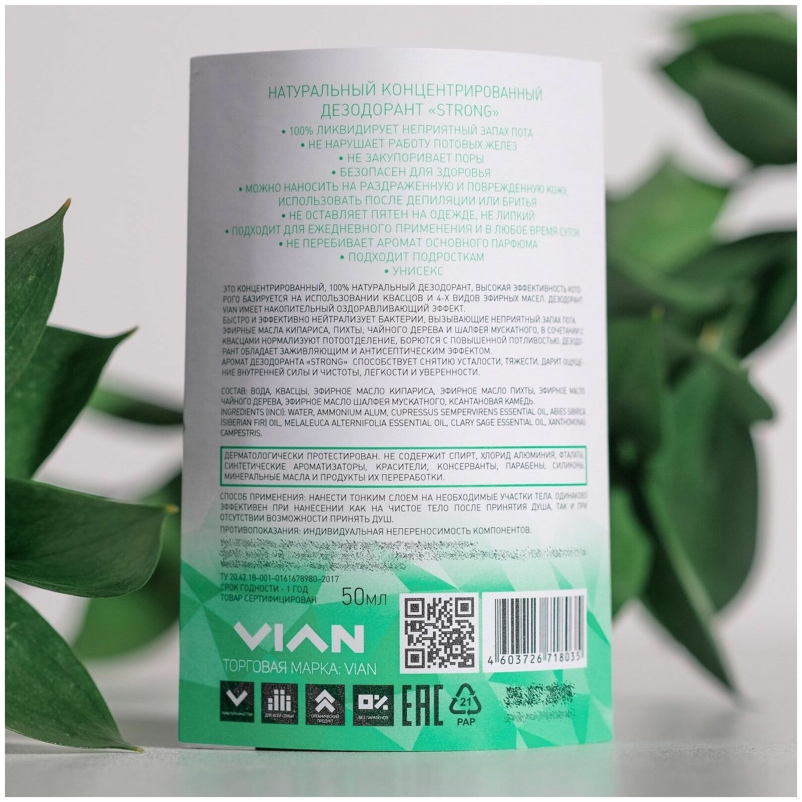 Натуральный концентрированный дезодорант VIAN "STRONG", 50 мл