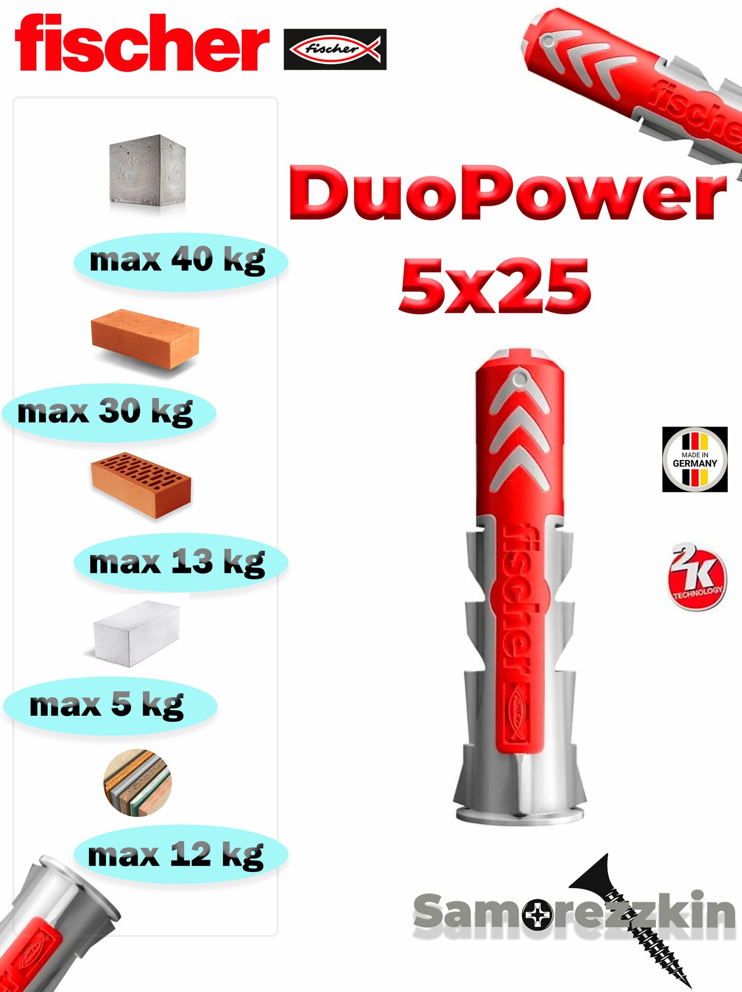 Дюбель Fischer DuoPower, нейлон, универсальный, 5x25мм, 60 шт интересное: