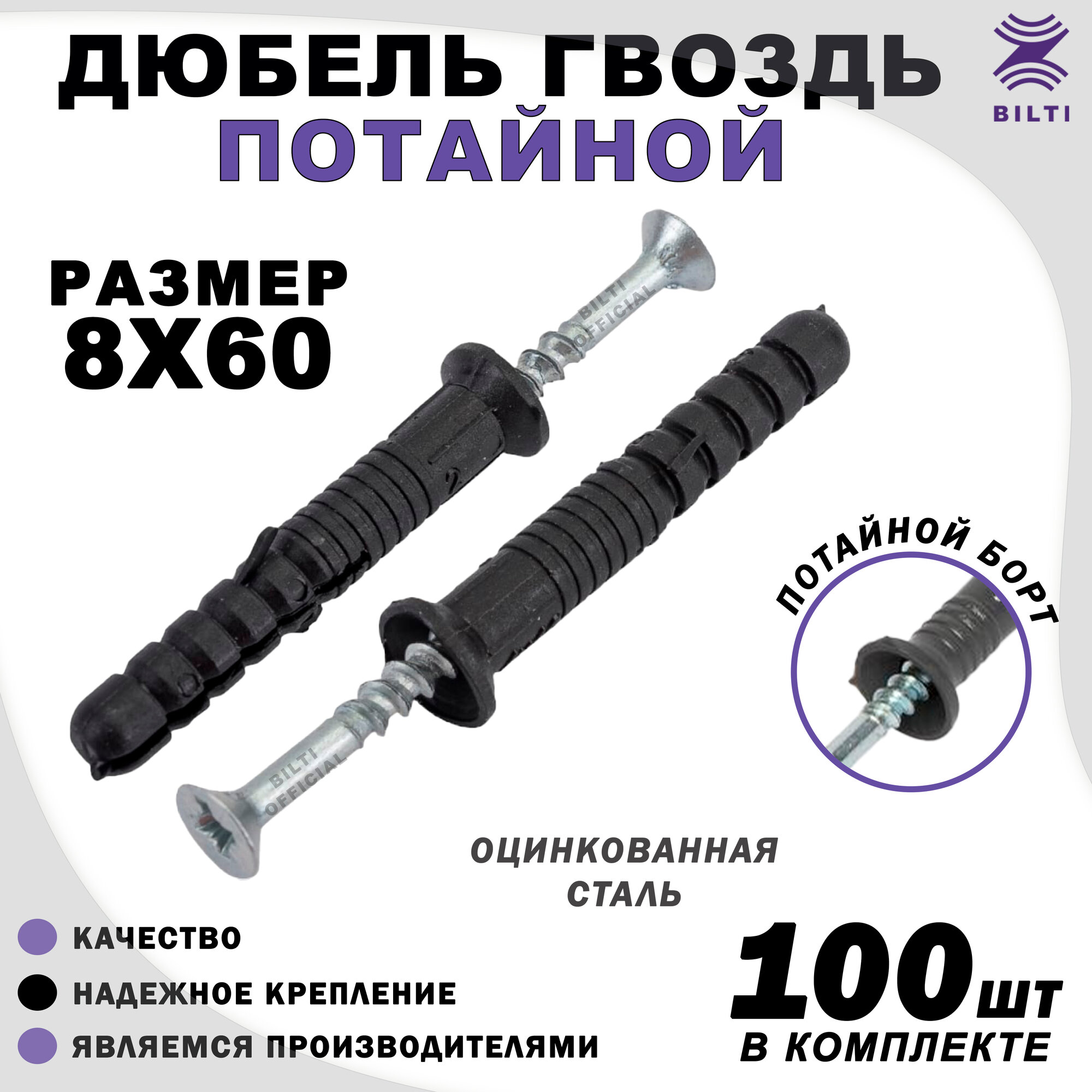 Купить Дюбель-гвоздь "потайной" Bilti, полипропилен, 8x60 мм (100шт)