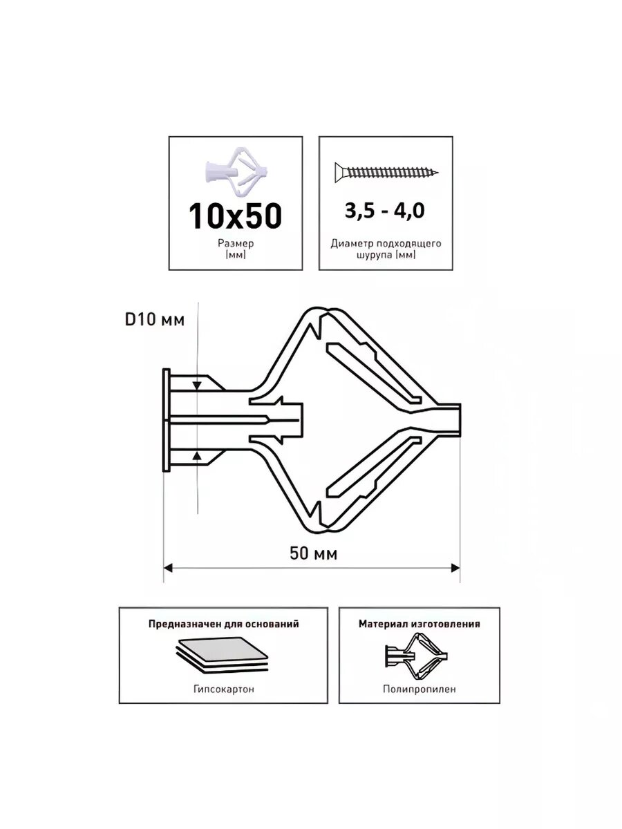 Дюбель-бабочка TECH-KREP, для гипсокартона, полипропилен, 10x50 мм, 200 штук интересное: