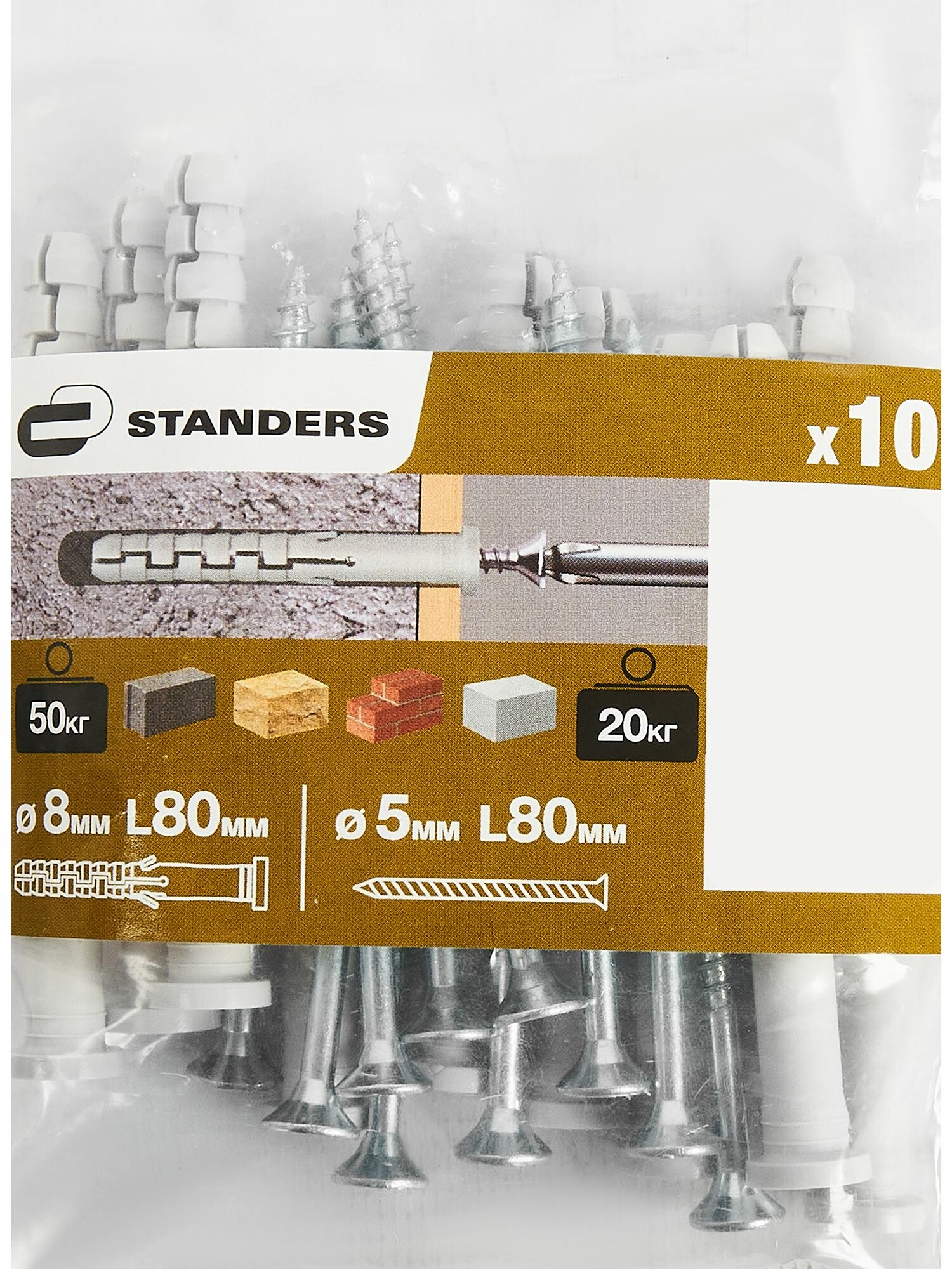 Дюбель с цилиндрическим бортиком Standers PNDS 8x80 мм, с шурупом 5x80 мм, нейлон, 10 шт. интересное: