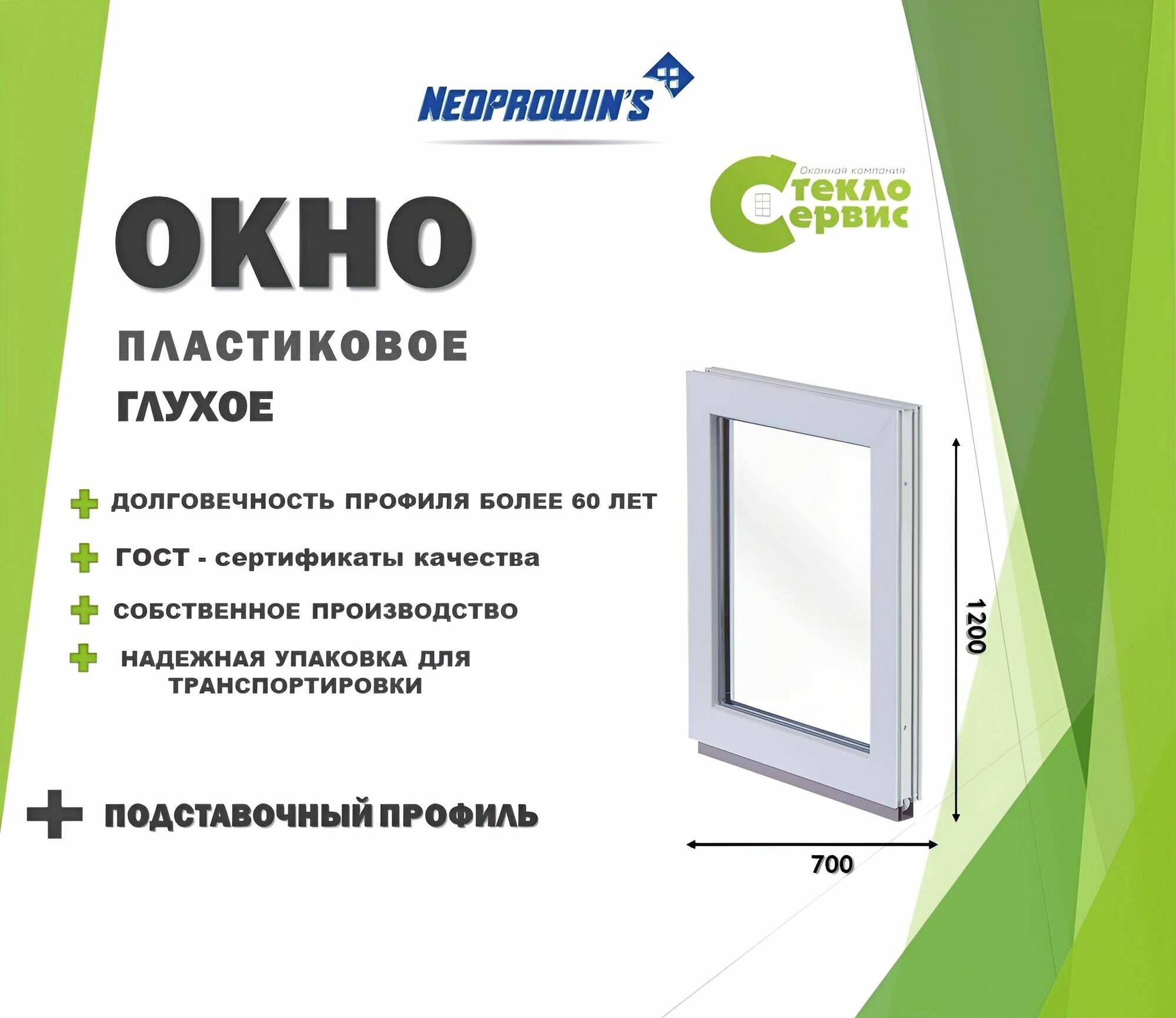 Глухое окно NEOPROVINS 700х1200 (ШхВ) с подставочным профилем интересное: