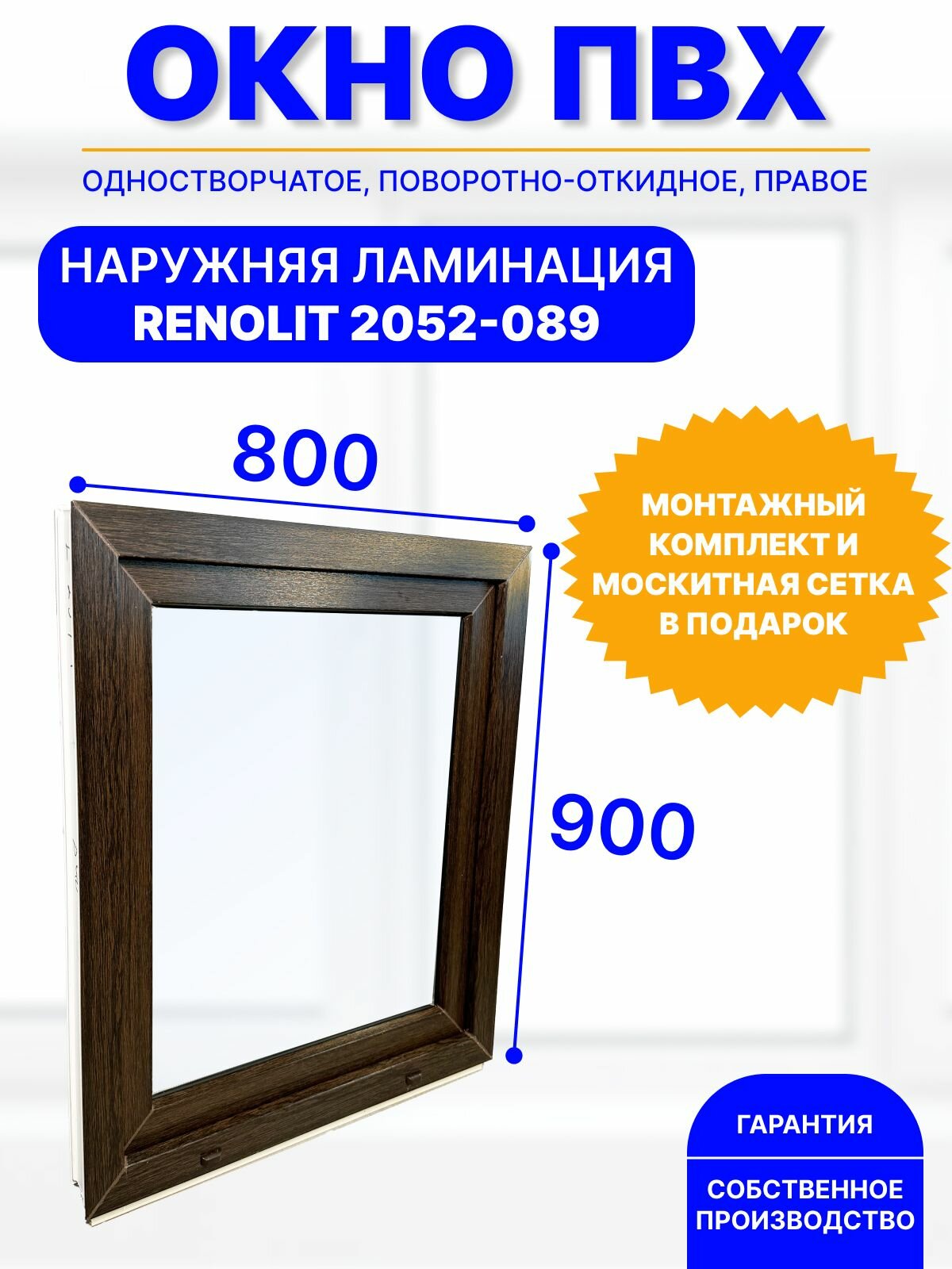 Купить Пластиковое окно ПВХ 800 х 900 мм, поворотно-откидное правое, двухкамерный энергосберегающий стеклопакет, белоe + наружняя ламинация темный дуб