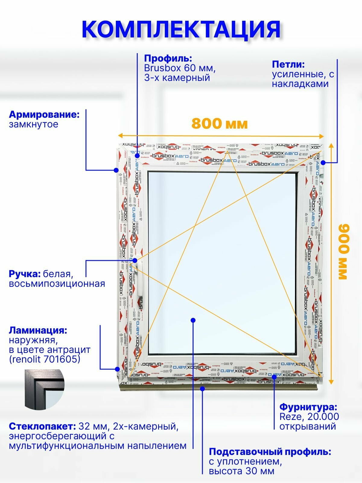 Купить Пластиковое окно ПВХ 800 х 900 мм, поворотно-откидное правое, двухкамерный энергосберегающий стеклопакет, белоe + наружняя ламинация антрацит