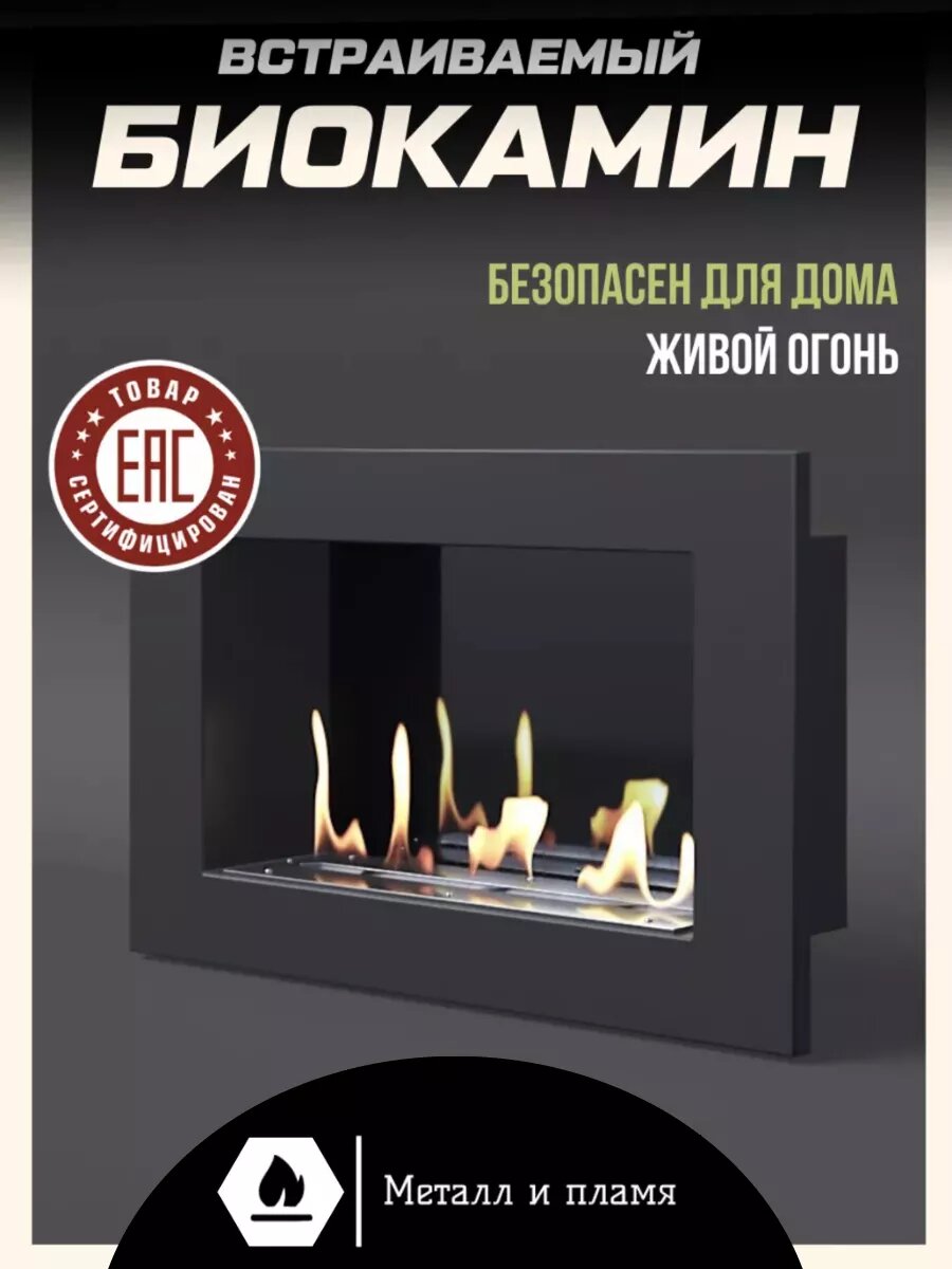 Встраиваемый биокамин от Металл и пламя "Премиум 1100V", 2 стекла в комплекте, регулировка пламени, сталь