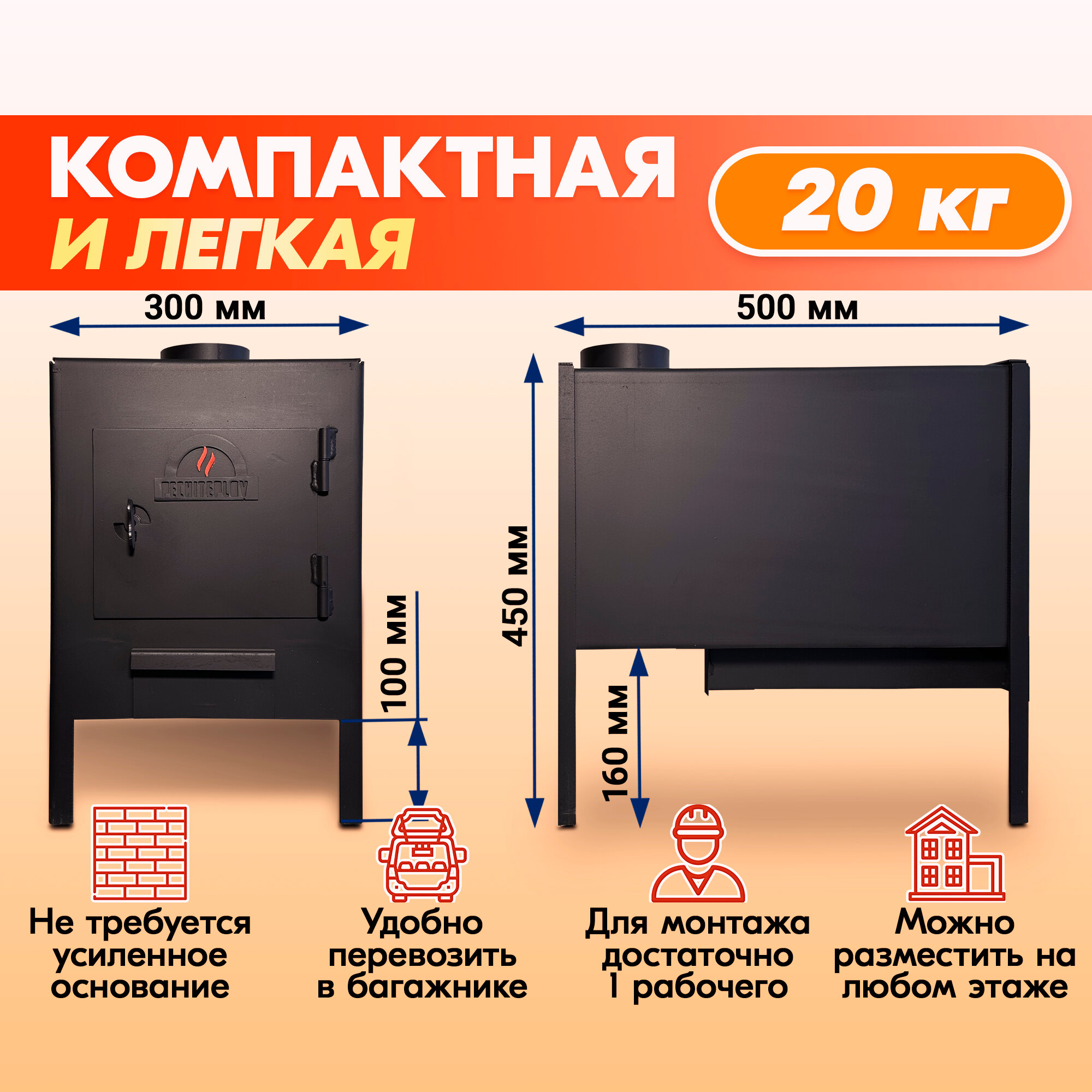 Отопительная печь Буржуйка печитеплов 80 Б с конфоркой, зольником и конвекционными стенками, дровяная печь для дома