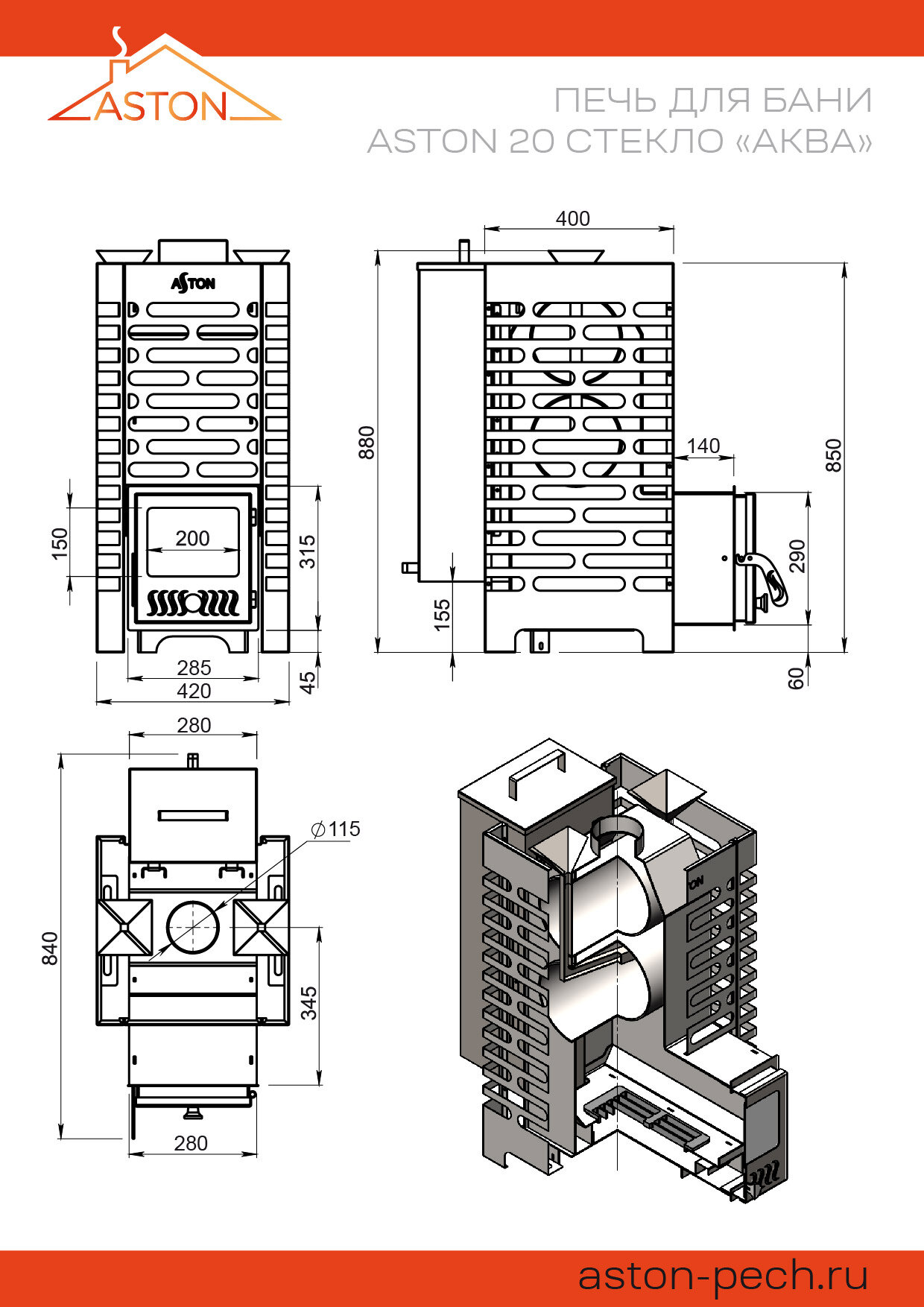 Печь для бани дровяная ASTON 20 стекло "АКВА" диаметр дымоход 115 интересное: