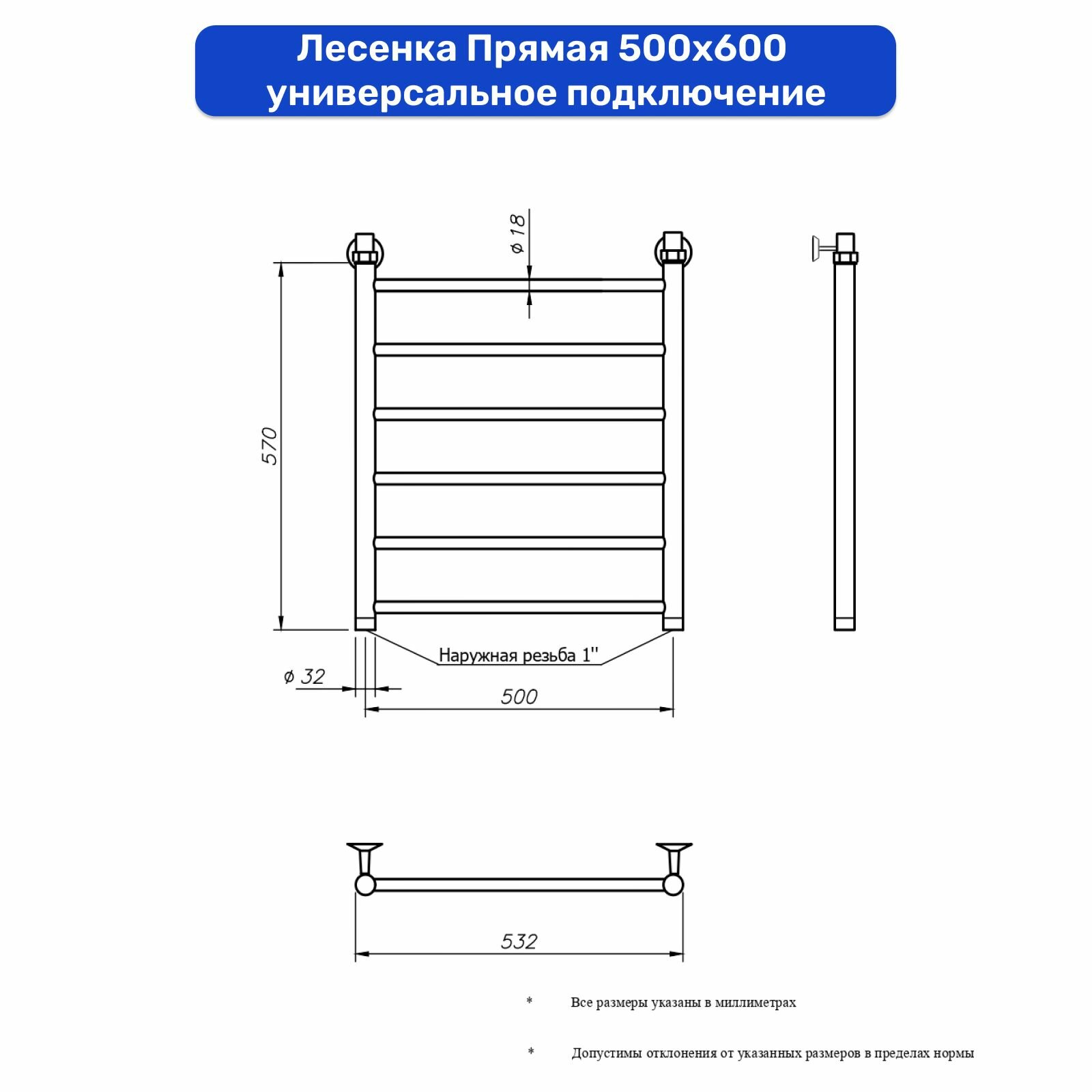 Полотенцесушитель водяной Лесенка Прямая 500х600 белый универсальное подключение наружная резьба 1 дюйм