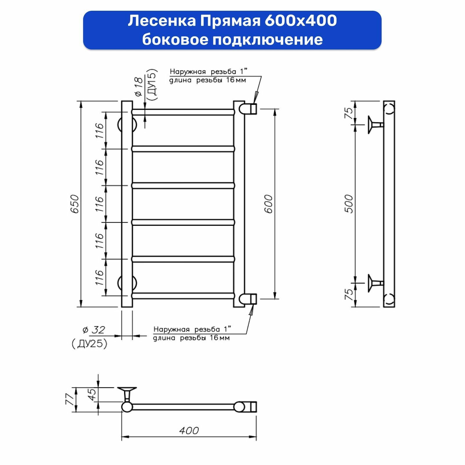 Полотенцесушитель Лесенка Прямая 600х400 универсальное боковое подключение 1 дюйм