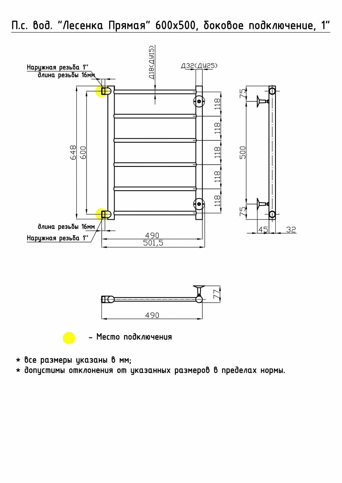 Полотенцесушитель Лесенка Прямая 600х500 белый универсальное боковое подключение 1 дюйм