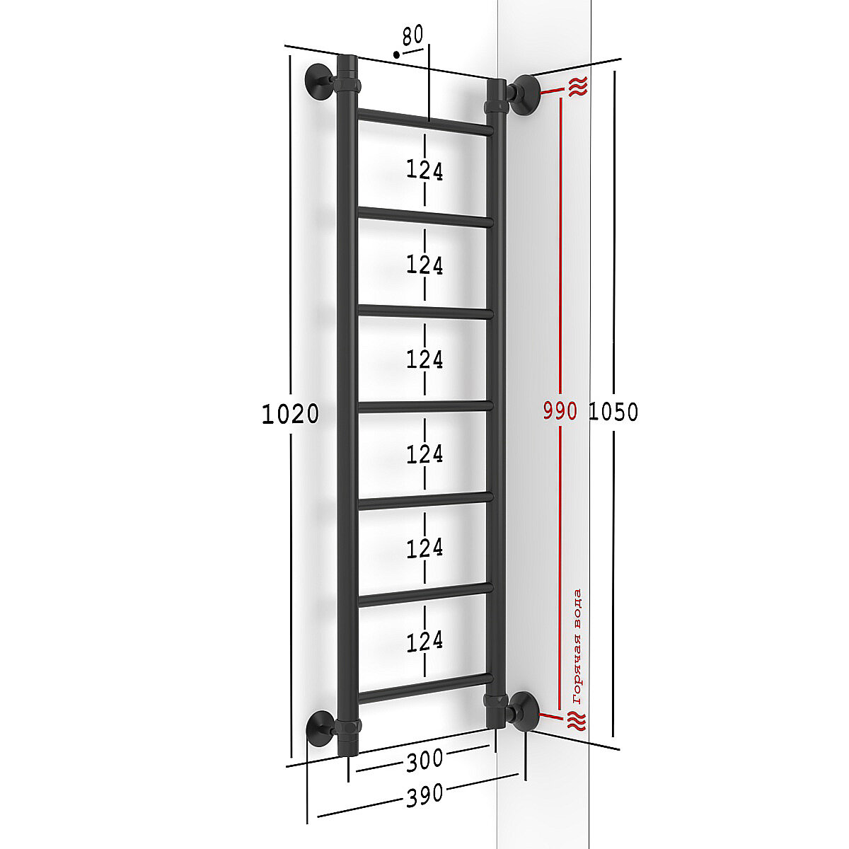 Полотенцесушитель Водяной Onix, модель Classic Black Left 300x1000 Лесенка с боковым подключением слева, черный матовый, полный комплект